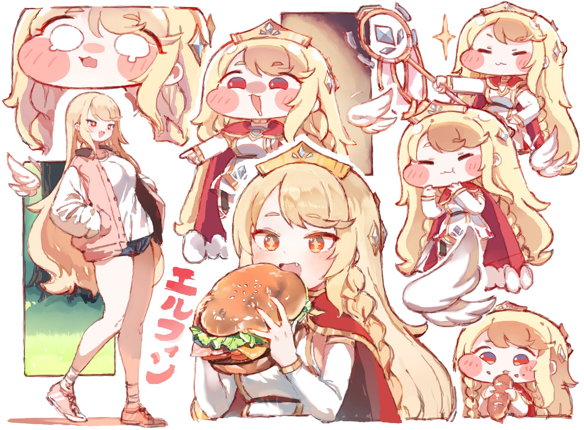 1girl :3 blonde_hair blue_shorts braid bread breasts burger cape character_name chibi chibi_inset closed_eyes commentary_request detached_wings dress erpin_(trickcal) food food_on_face hair_ornament highres holding holding_burger holding_food jacket kotatu_(akaki01aoki00) large_breasts long_hair long_sleeves multiple_views open_clothes open_jacket open_mouth pink_shoes red_cape red_eyes shoes short_shorts shorts side_braids socks sparkle tiara trickcal very_long_hair white_dress white_socks white_wings wings