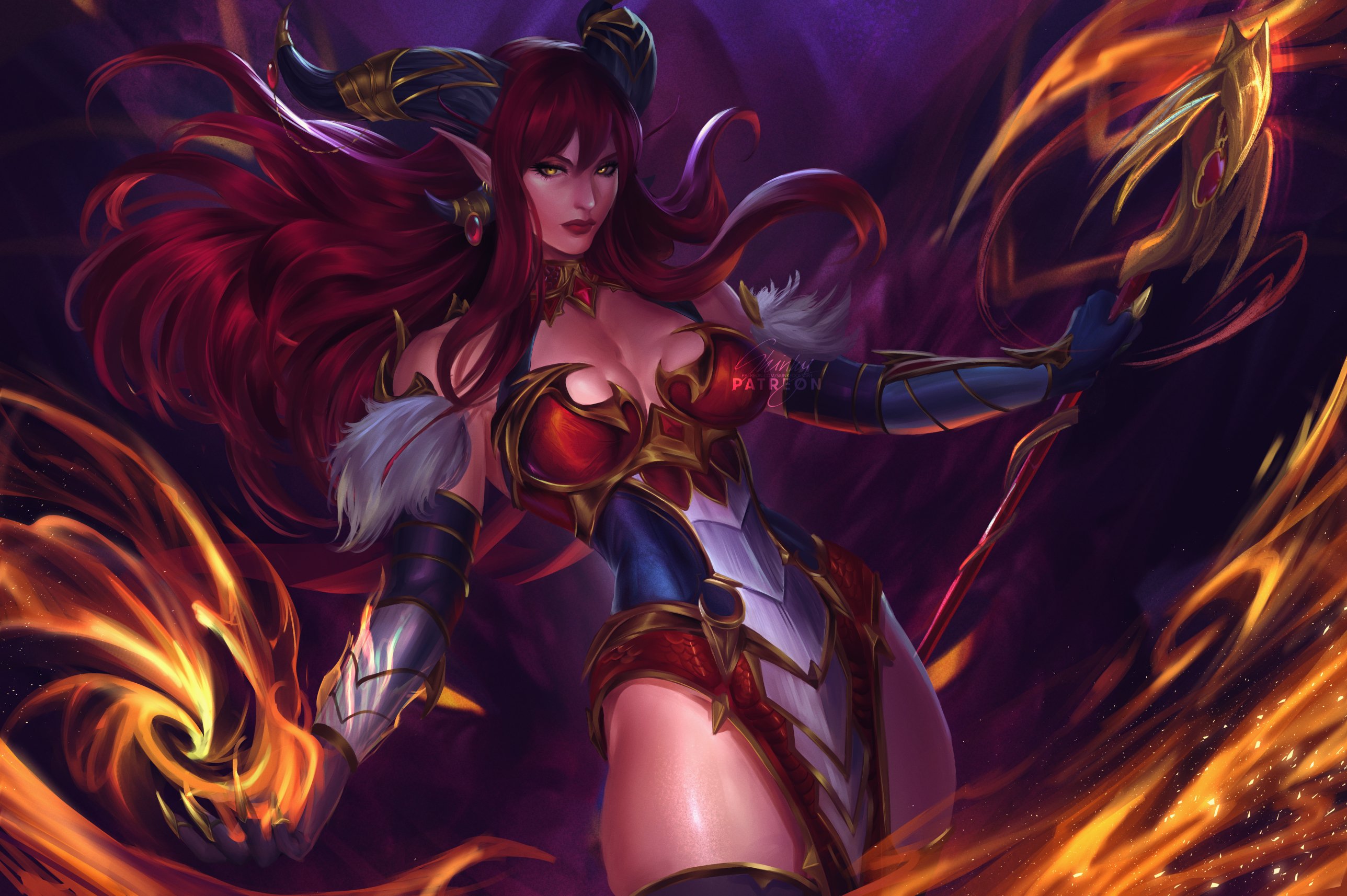 1girl alexstrasza armor bare_shoulders black_gloves boobplate breastplate breasts claw_ring cleavage commentary dragon_girl dragon_horns elbow_gloves english_commentary fire floating_hair fur_trim gloves gold_trim highres holding holding_staff horn_ornament horns jewelry lips long_hair magic patreon_username pelvic_curtain pointy_ears red_hair red_lips red_scales scales skinky solo staff thighhighs thighs vambraces very_long_hair warcraft weapon world_of_warcraft yellow_eyes