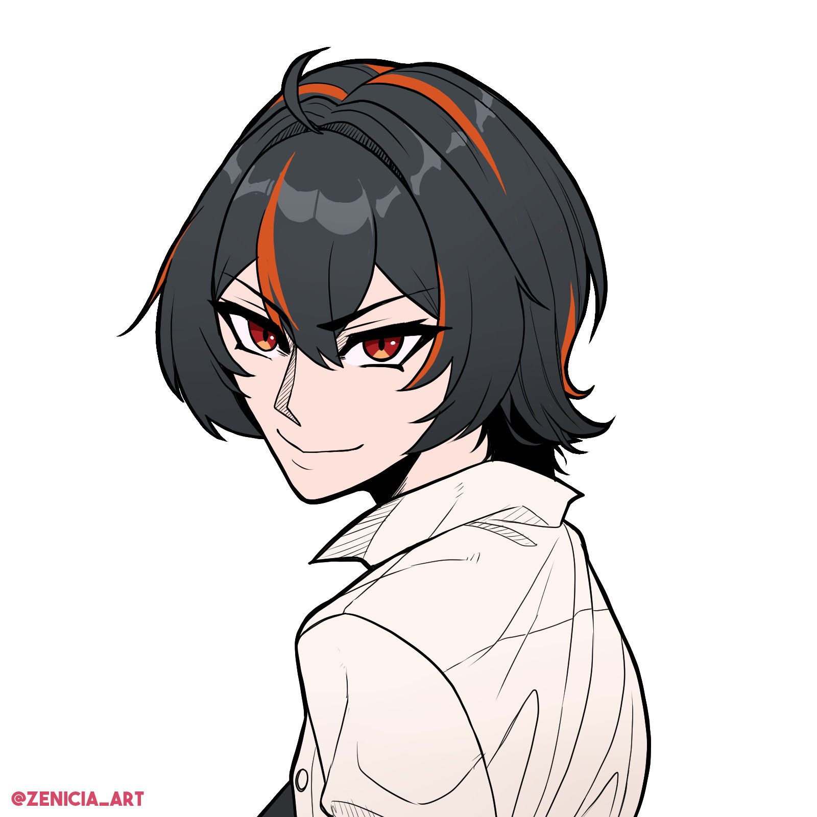 1girl alternate_costume alternate_hair_length alternate_hairstyle black_hair commentary english_commentary highres multicolored_hair orange_eyes red_streaks shirt short_hair streaked_hair twitter_username v-shaped_eyebrows white_shirt zenicia_art zenless_zone_zero zhu_yuan