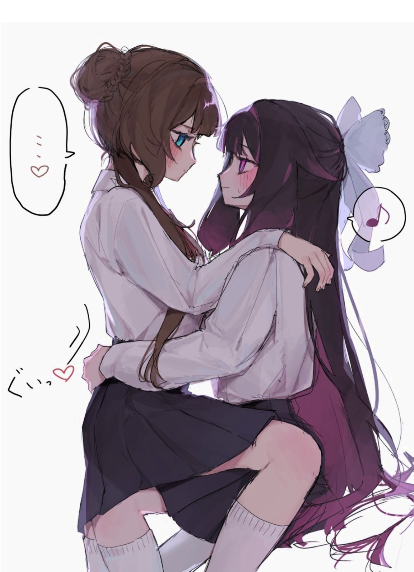 2girls black_hair black_skirt blue_eyes brown_hair columbina_(genshin_impact) commentary eye_contact genshin_impact grey_background hair_bun heart highres kneehighs looking_at_another multicolored_hair multiple_girls musical_note negi_negi_dayo pleated_skirt profile purple_eyes purple_hair sandrone_(genshin_impact) school_uniform shirt simple_background sitting sitting_on_lap sitting_on_person skirt socks spoken_heart spoken_musical_note two-tone_hair untranslatable_commentary white_shirt white_socks yuri