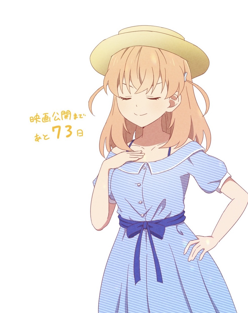 1girl blue_dress brown_hat buttons closed_mouth commentary_request countdown dress facing_viewer hand_on_own_chest hand_on_own_hip hat highres hinoshita_kaho link!_like!_love_live! love_live! makki_do off-shoulder_dress off_shoulder orange_hair puffy_short_sleeves puffy_sleeves short_sleeves simple_background smile solo translation_request v-shaped_eyebrows virtual_youtuber white_background