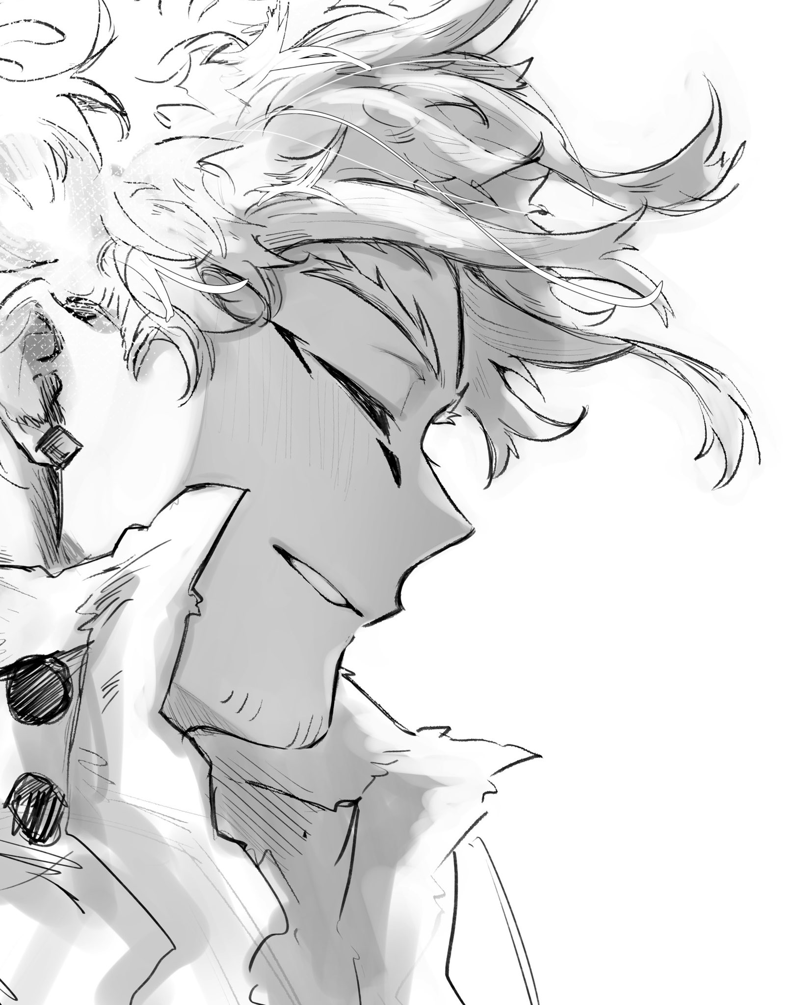 1boy boku_no_hero_academia closed_eyes collared_jacket facial_mark floating_hair forked_eyebrows greyscale hawks_(boku_no_hero_academia) highres hkiine8 jacket male_focus monochrome portrait profile simple_background smile solo thick_eyebrows white_background
