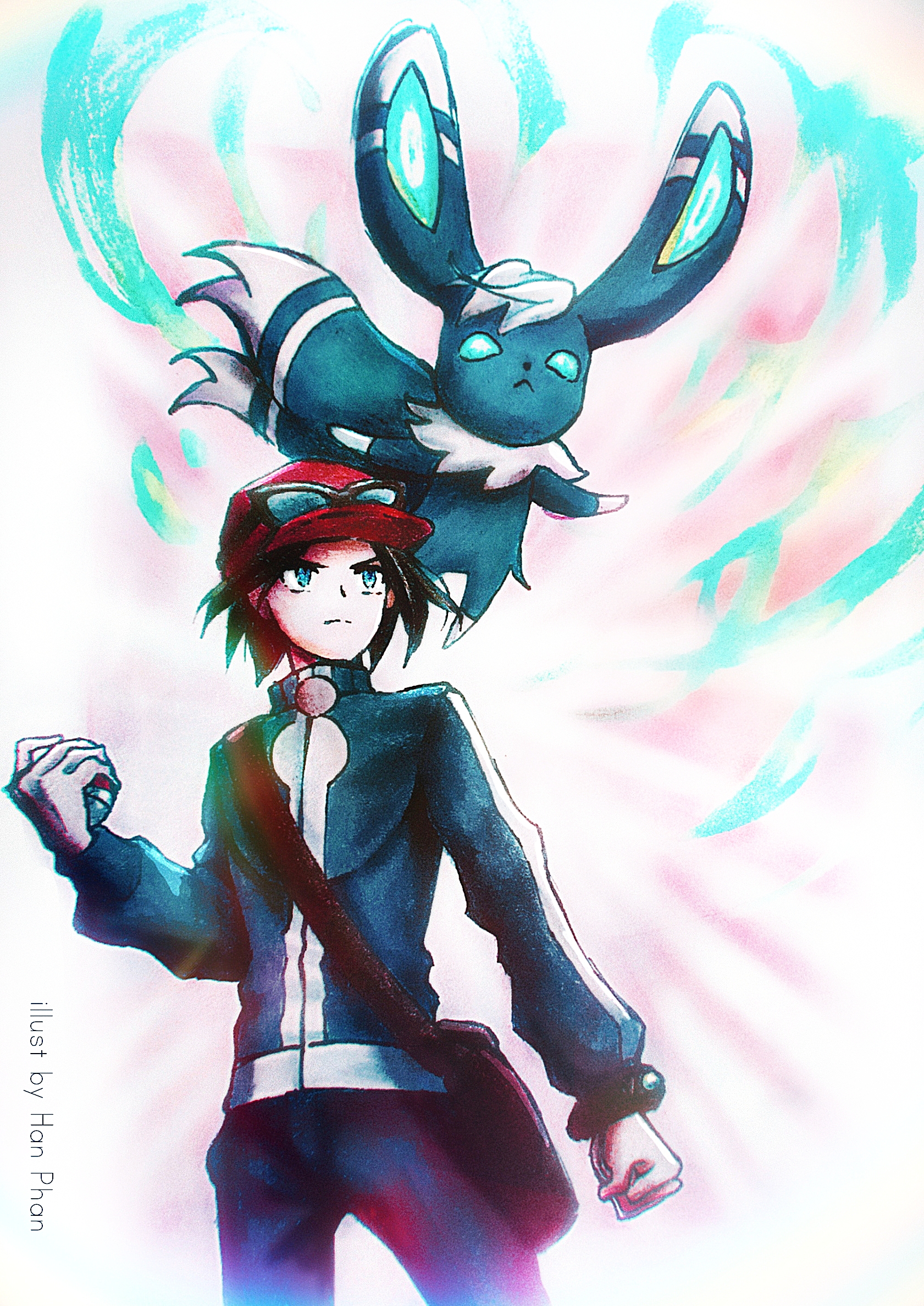 1boy artist_name black_hair blue_jacket calem_(pokemon) cowboy_shot eyewear_on_headwear floating gen_6_pokemon han_(hangngalephan) hat highres holding holding_poke_ball jacket levitation male_focus mega_ring meowstic meowstic_(male) nintendo poke_ball poke_ball_(basic) pokemon pokemon_(creature) pokemon_x_and_y red_hat sunglasses