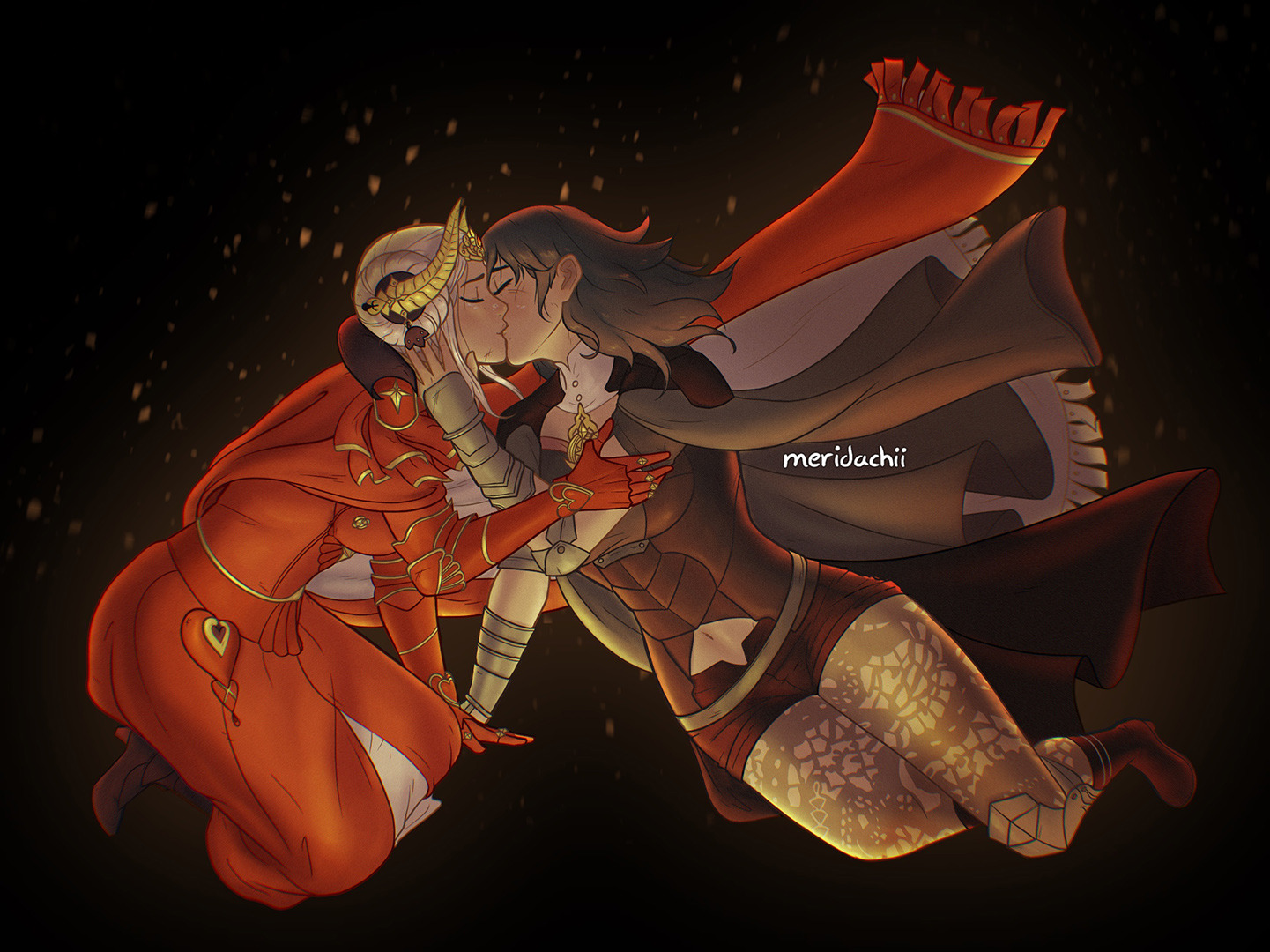 2girls armor armored_dress artist_name black_background black_jacket black_shorts blue_hair boots breasts cape closed_eyes clothing_cutout commentary double_bun dress edelgard_von_hresvelg edelgard_von_hresvelg_(timeskip) english_commentary fake_horns female_byleth_(fire_emblem) fire_emblem fire_emblem:_three_houses hair_bun horned_headwear horns jacket kiss kneeling lace lace_pantyhose large_breasts meridachii multiple_girls navel_cutout nintendo pantyhose red_armor red_cape red_dress shorts tiara white_hair yuri
