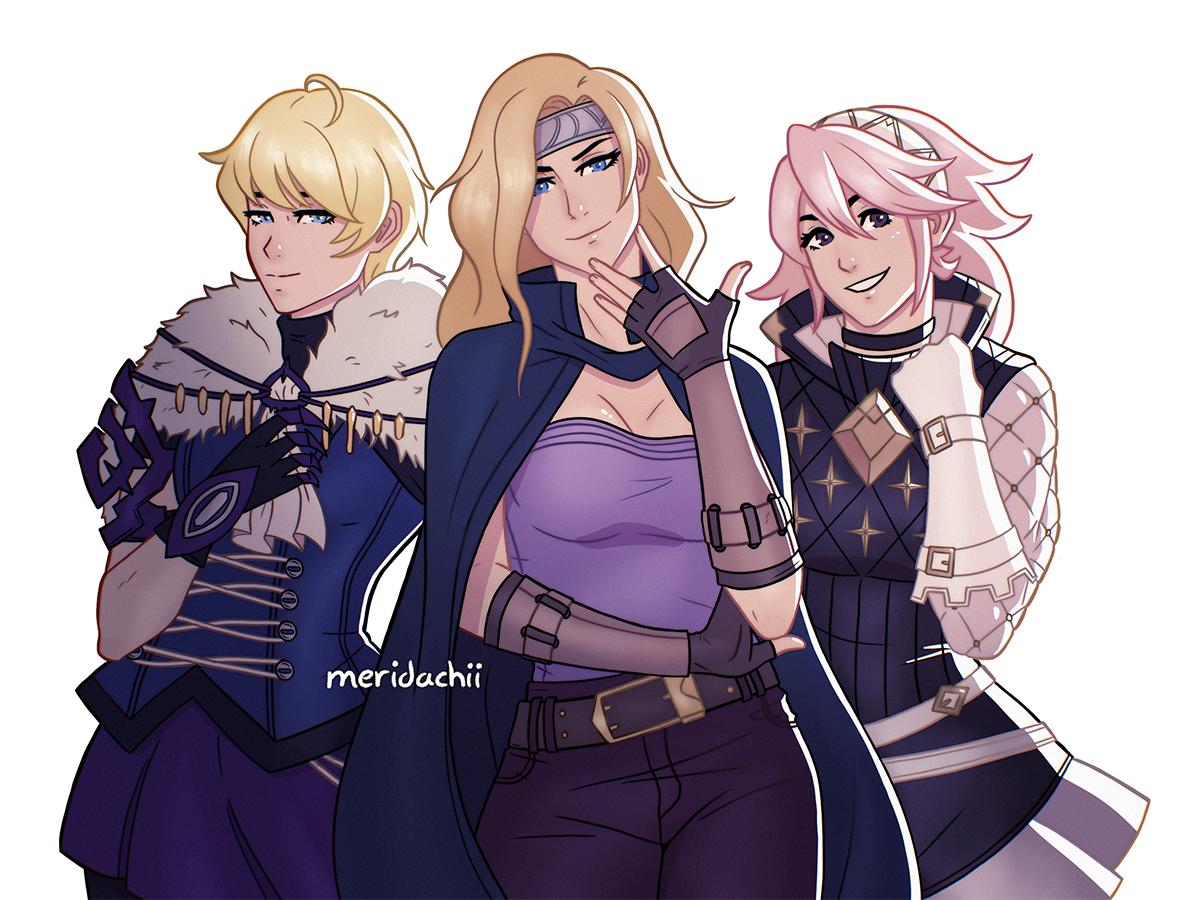 3girls ahoge artist_name ascot belt black_choker blonde_hair blue_cape blue_dress blue_eyes blue_shirt breasts cape choker commentary dress elbow_gloves english_commentary fingerless_gloves fire_emblem fire_emblem:_radiant_dawn fire_emblem_engage fire_emblem_fates fur_trim gambeson gloves hairband hand_on_own_chest hand_up headband heather_(fire_emblem) long_hair long_sleeves looking_at_viewer medium_breasts meridachii merrin_(fire_emblem) multiple_girls nintendo pants pelt pink_hair purple_eyes purple_pants purple_shirt shirt short_dress short_hair shorts shorts_under_skirt small_breasts smile soleil_(fire_emblem) standing strapless strapless_shirt trait_connection white_ascot white_background white_belt white_gloves white_hairband white_headband