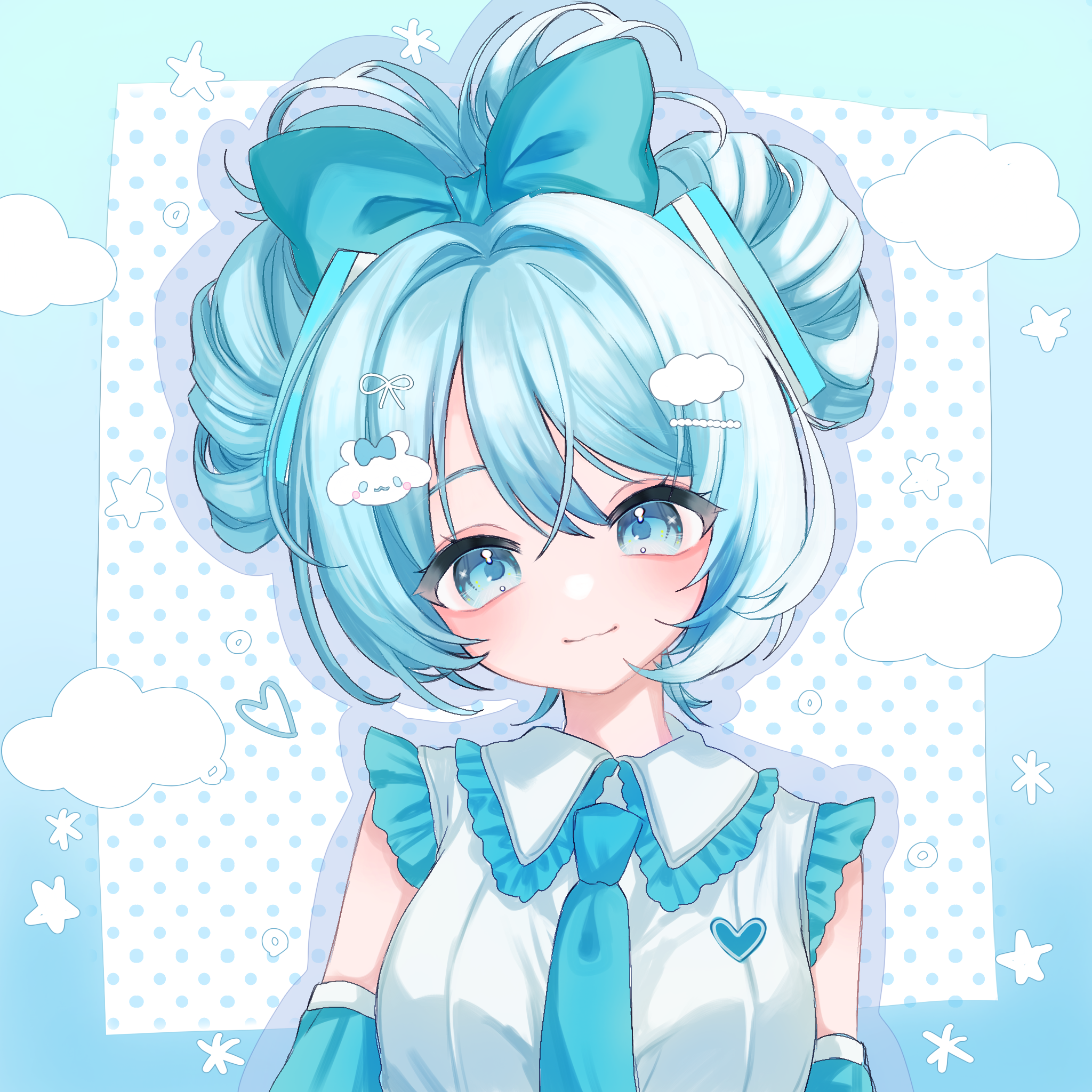 1girl :3 arms_at_sides bare_shoulders blue_border blue_bow blue_eyes blue_hair blue_necktie blue_trim blush border bow breasts character_hair_ornament cinnamiku cinnamoroll closed_mouth cloud collared_shirt commentary detached_sleeves double-parted_bangs drop_shadow folded_twintails frilled_shirt frilled_shirt_collar frills fuwa_fuwa_cinnamoroll hair_between_eyes hair_bow hair_ornament hatsune_miku head_tilt highres long_sleeves looking_at_viewer necktie outside_border polka_dot polka_dot_background sanrio shiina_(qh38crgwgf1yeut) shirt short_hair sidelocks simple_background sleeveless sleeveless_shirt small_breasts smile solo star_(symbol) straight-on tareme untranslatable_commentary upper_body vocaloid white_background white_shirt white_trim