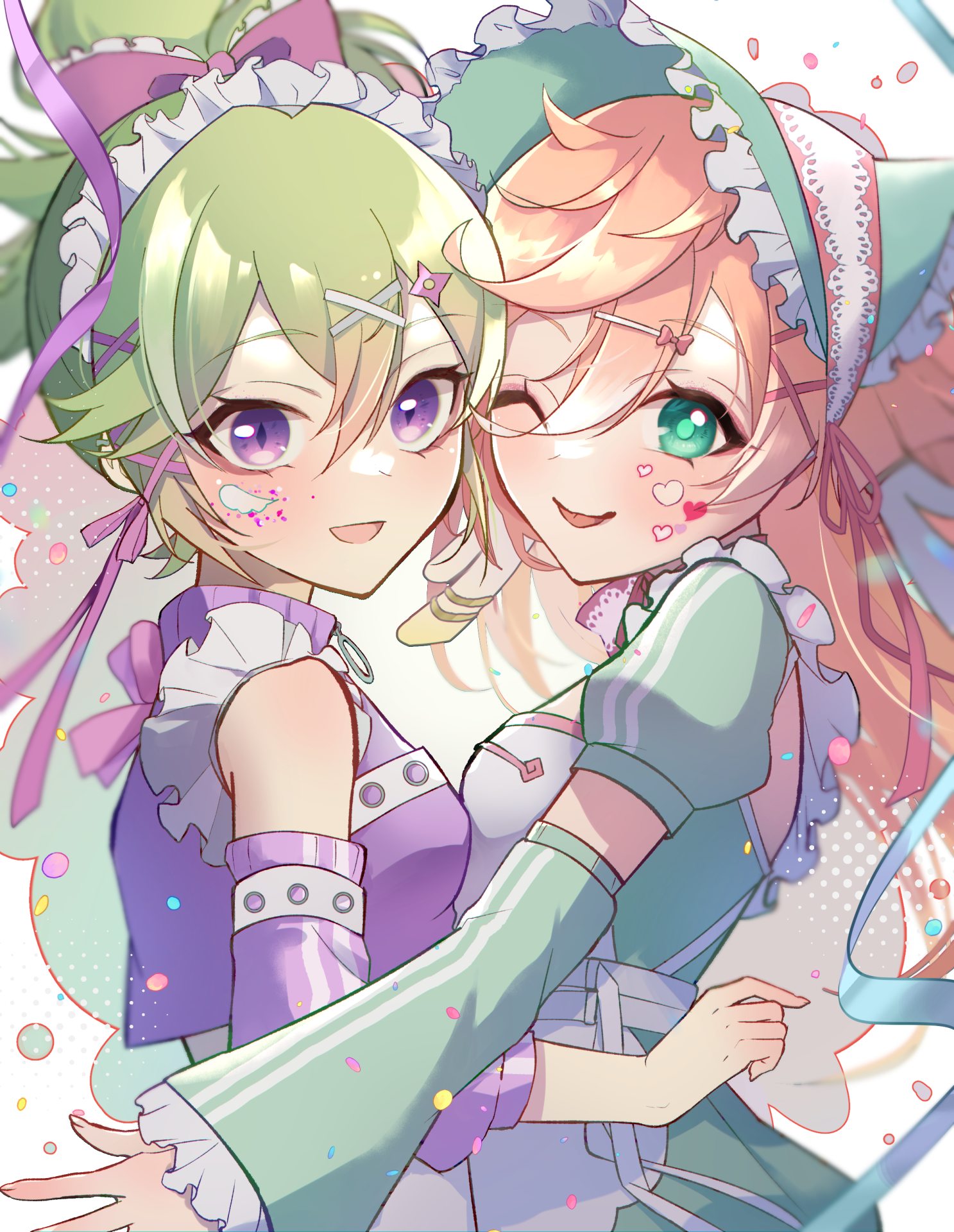 2girls 3sat0 alternate_costume antlers apron aqua_dress aqua_eyes aqua_sleeves bonnet bow breasts commentary_request cropped_jacket dated detached_sleeves dress facial_mark frilled_apron frilled_hairband frills from_side genshin_impact green_hair hair_between_eyes hair_bow hair_ornament hair_ribbon hairband hairclip heart highres horns jacket kuki_shinobu long_hair looking_at_viewer multiple_girls one_eye_closed open_mouth pink_hair purple_eyes purple_jacket purple_sleeves ribbon small_breasts smile tongue tongue_out upper_body white_apron yanfei_(genshin_impact)