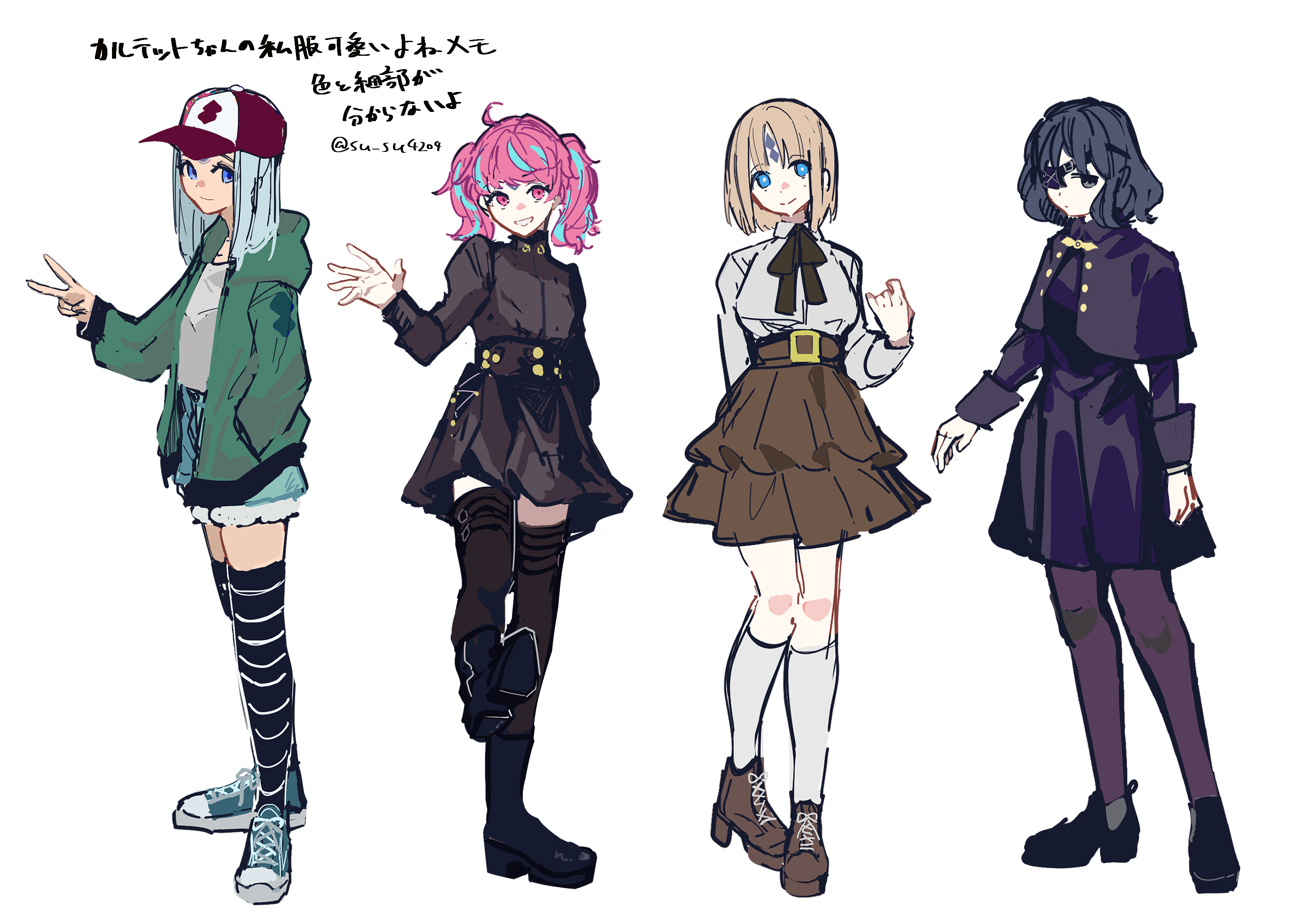 4girls ahoge aqua_shoes black_boots black_shoes black_thighhighs blonde_hair blue_eyes blue_hair blue_shorts boots bow bowtie breasts brown_boots brown_bow brown_bowtie brown_dress brown_skirt brown_thighhighs capelet casual commentary_request cross-laced_shoes dress eyepatch fate/strange_fake fate_(series) full_body green_jacket grey_hair hand_in_pocket hat highres hood hooded_jacket jacket katya_kambanellis large_breasts long_sleeves looking_at_viewer maysia_kwo medium_hair multicolored_hair multiple_girls pantyhose pink_eyes pink_hair purple_capelet purple_dress purple_pantyhose red_hat shanti_mukherjee shirt shoes short_hair shorts skirt socks standing standing_on_one_leg streaked_hair striped_clothes striped_thighhighs su_su4204 thighhighs translation_request twintails v viola_wahlstrom white_shirt white_socks