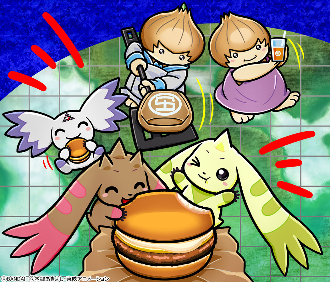 burgamon_adult burger culumon digimon digimon_(creature) eating green_eyes horns looking_at_viewer lopmon lotteria official_art one_eye_closed pointy_ears smile terriermon triangle zero_unit
