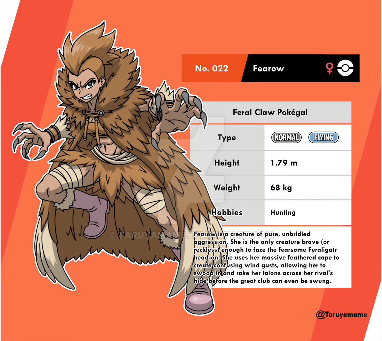 1girl abs bandaged_leg bandages boots bracelet brown_eyes brown_hair clenched_teeth commentary crop_top deviantart_logo deviantart_username english_commentary english_text fearow feather-trimmed_jacket feather_skirt fingernails fur-trimmed_boots fur_trim gen_1_pokemon jewelry looking_at_viewer mohawk nintendo personification pink_boots pokedex_number pokemon pokemon_sword_and_shield sharp_fingernails solo taruyamame teeth