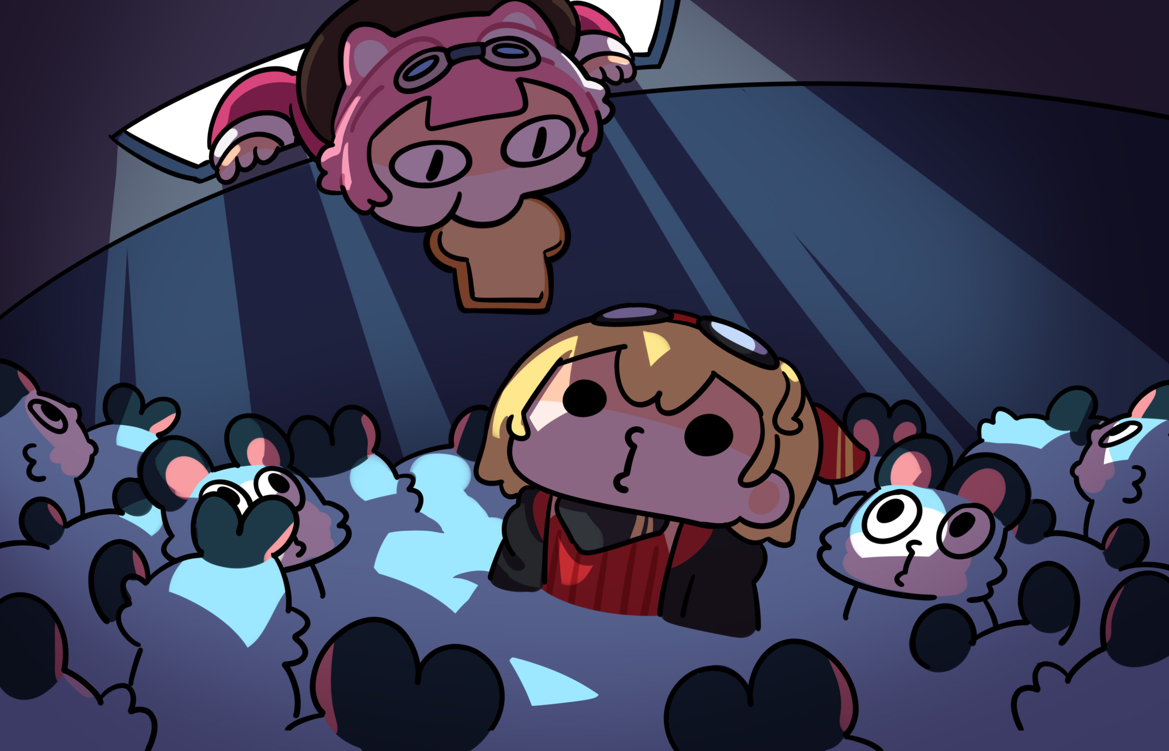 2girls animal_ears beret blonde_hair bread bread_slice chattino_(raora_panthera) feeding food goggles goggles_on_head hair_ribbon hat highres hololive hololive_english hololive_indonesia kaela_kovalskia kaela_kovalskia_(4th_costume) keenbiscuit multicolored_hair multiple_girls o3o panther_ears panther_girl pink_hair raora_panthera raora_panthera_(1st_costume) ribbon streaked_hair virtual_youtuber white_hair