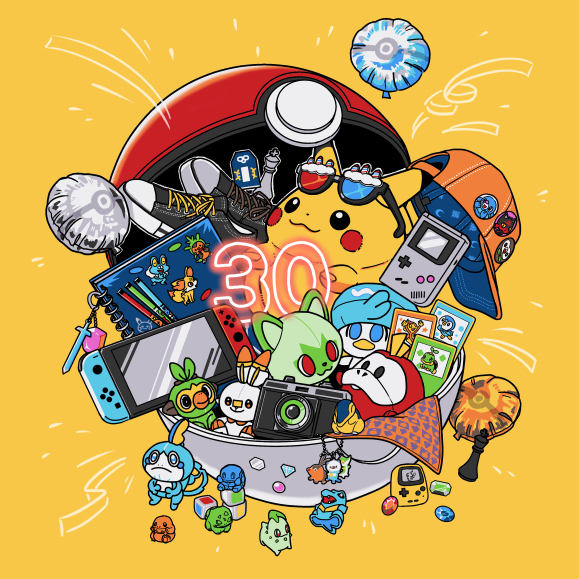 anniversary balloon baseball_cap black-framed_eyewear black_shoes blue_gem bulbasaur camera card charm_(object) charmander chespin chess_piece chikorita chimchar commentary_request cyndaquil dice fat_pikachu fennekin froakie fuecoco game_boy game_boy_(original) gem gen_1_pokemon gen_2_pokemon gen_3_pokemon gen_4_pokemon gen_5_pokemon gen_6_pokemon gen_7_pokemon gen_8_pokemon green_gem grookey handheld_game_console hat litten mudkip nintendo nintendo_switch no_humans notebook object_focus open_poke_ball orange_hat oshawott pikachu piplup pocket_pikachu poke_ball poke_ball_(basic) poke_ball_theme pokemon pokemon_black_and_white pokemon_card pokemon_day pokemon_diamond/pearl/platinum pokemon_gold/silver/crystal pokemon_red/green/blue/yellow pokemon_ruby/sapphire/emerald pokemon_sun_and_moon pokemon_scarlet_and_violet pokemon_sword_and_shield pokemon_tcg pokemon_x_and_y popplio quaxly red_gem rowlet sakuramochi0906 scorbunny shoelaces shoes snivy sobble sprigatito squirtle streamers stuffed_toy tepig tinted_eyewear torchic totodile trading_card treecko turtwig unworn_shoes yellow_background