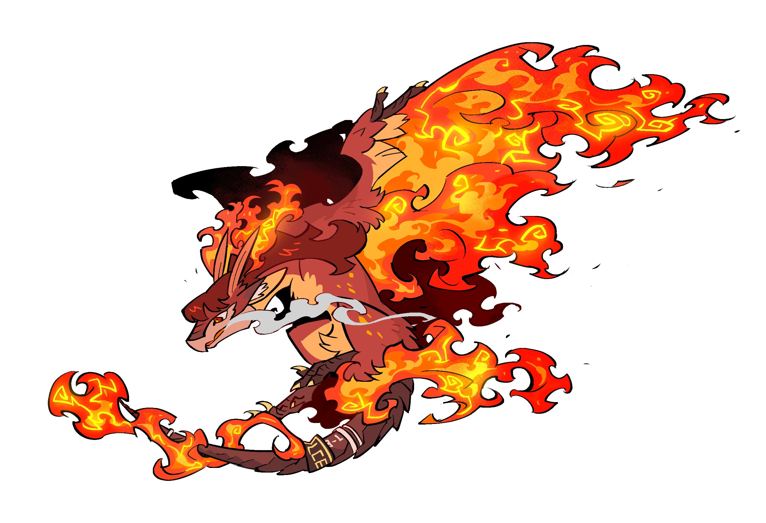 alyssa_(project_moon) animalization ardor_blossom_star_(e.g.o) dragon e.g.o_(project_moon) fiery_wings fire flying highres kgdjeisk limbus_company long_hair open_mouth project_moon red_eyes red_hair simple_background smoke_from_mouth tail_strap white_background wings