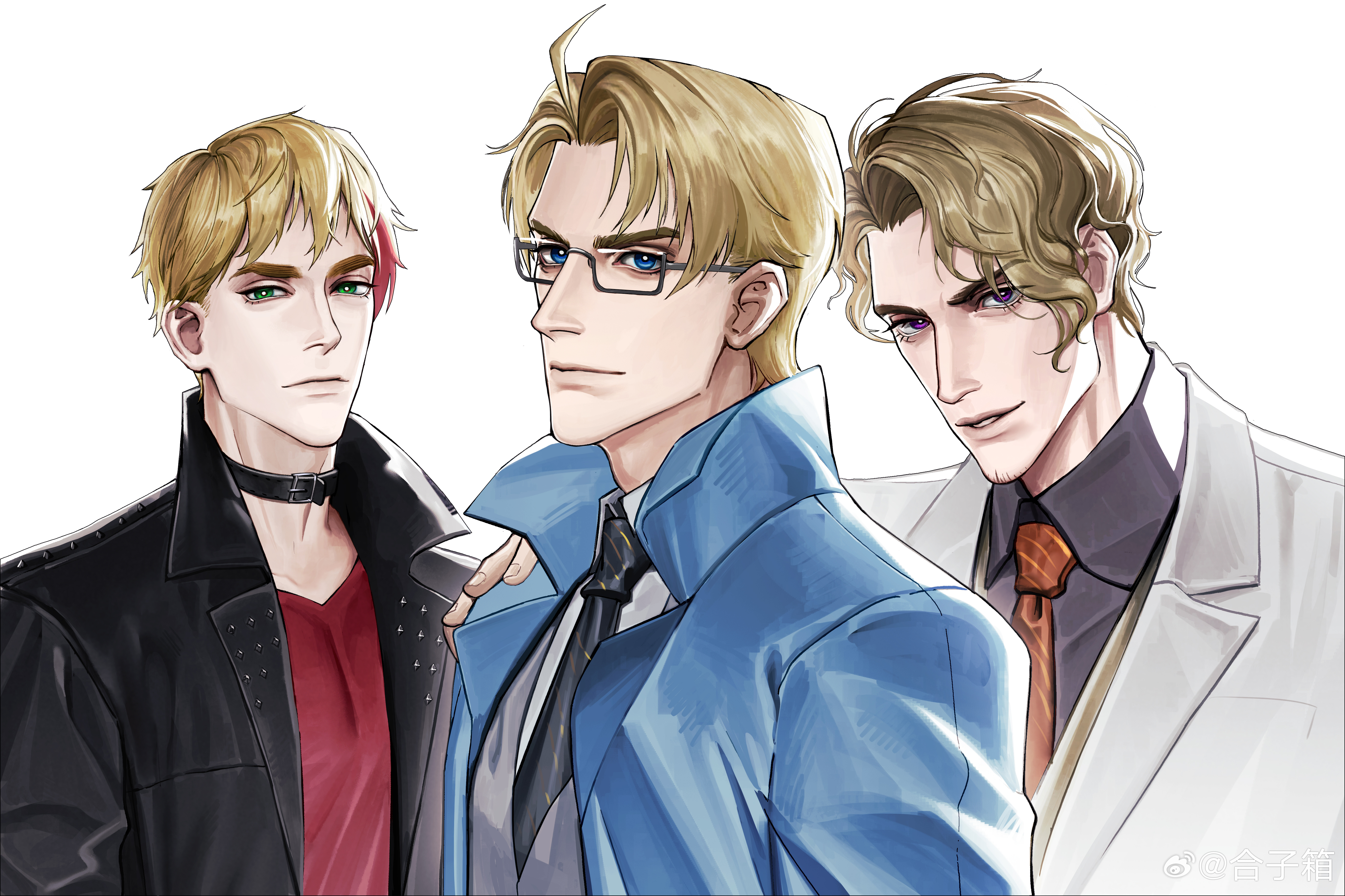 3boys absurdres america_(hetalia) axis_powers_hetalia blonde_hair blue_eyes chinese_commentary choker collared_shirt commentary_request cropped_head facial_hair formal_clothes france_(hetalia) glasses goatee_stubble green_eyes hezi_xiang highres jacket looking_at_viewer male_focus multicolored_hair multiple_boys necktie open_mouth purple_eyes shirt short_hair simple_background smile streaked_hair stubble suit thick_eyebrows united_kingdom_(hetalia) upper_body watermark weibo_watermark white_background