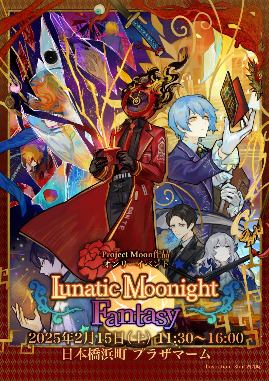 angela_(project_moon) apple aqua_eyes argalia_(project_moon) ayin_(project_moon) black_gloves black_pants black_shirt blue_coat blue_hair blue_scarf broken_glass catherine_(project_moon) clock closed_mouth coat collared_shirt commentary_request don_quixote_(project_moon) eyeball fire food frilled_sleeves frills fruit glass gloves golden_bough_(project_moon) heathcliff_(project_moon) highres holding_pda ishmael_(project_moon) lavacrum_sanguinis_(e.g.o) library_of_ruina limbus_company lobotomy_corporation lunacy_(limbus_company) lunatic_moonnight_fantasy necktie nishikujic object_head ootachi pants poster_(medium) project_moon red_coat red_necktie roland_(project_moon) scarf second-party_source shirt short_hair sinclair_(project_moon) smoking_pipe the_distortion_detective the_pallid_whale watch white_gloves white_trim wristwatch yellow_eyes yi_sang_(project_moon)