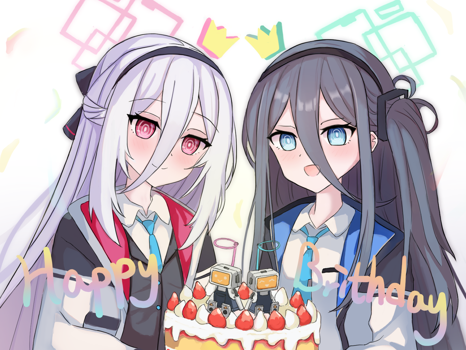 2girls aqua_necktie aris_(blue_archive) birthday birthday_cake black_hair black_hairband black_jacket blue_archive blue_eyes cake closed_mouth collared_shirt commentary_request crown_(symbol) food hair_between_eyes hairband half_updo halo happy_birthday highres jacket kei_(blue_archive) kei_(new_body)_(blue_archive) kei_(robot)_(blue_archive) long_hair long_sleeves looking_at_viewer multiple_girls necktie night_ling open_mouth pink_eyes shirt sidelocks smile strawberry_shortcake typo upper_body very_long_hair white_hair white_jacket white_shirt