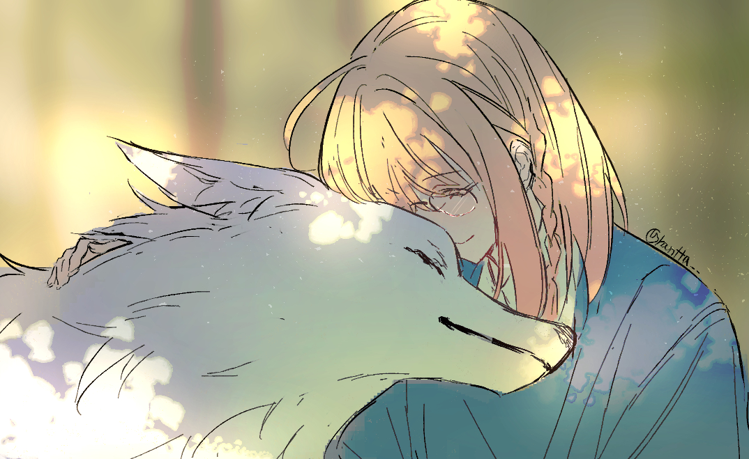 1girl ahoge artist_name blonde_hair braid closed_eyes closed_mouth commentary fate/strange_fake fate_(series) heads_together rantta round_eyewear sajou_ayaka_(fate/strange_fake) side_braid smile twitter_username untranslatable_commentary white_wolf wolf wolf_(fate)