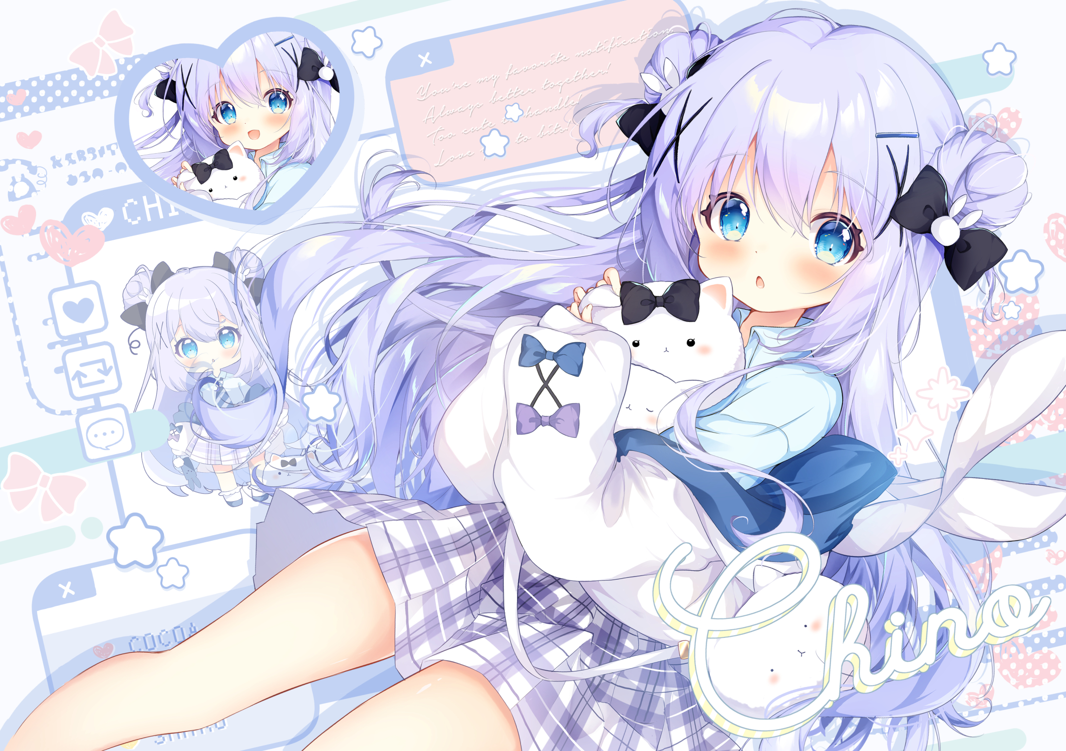 1girl :d :o black_bow blue_bow blue_hair blue_shirt blush bow chibi child commentary_request dot_nose double-parted_bangs double_bun feet_out_of_frame fukaya_rin gochuumon_wa_usagi_desu_ka? hair_between_eyes hair_bow hair_bun hair_ornament hairclip highres kafuu_chino long_hair long_sleeves looking_at_viewer miniskirt multiple_views open_mouth plaid_clothes plaid_skirt purple_bow shirt skirt sleeve_bow smile tippy_(gochiusa) white_skirt x_hair_ornament