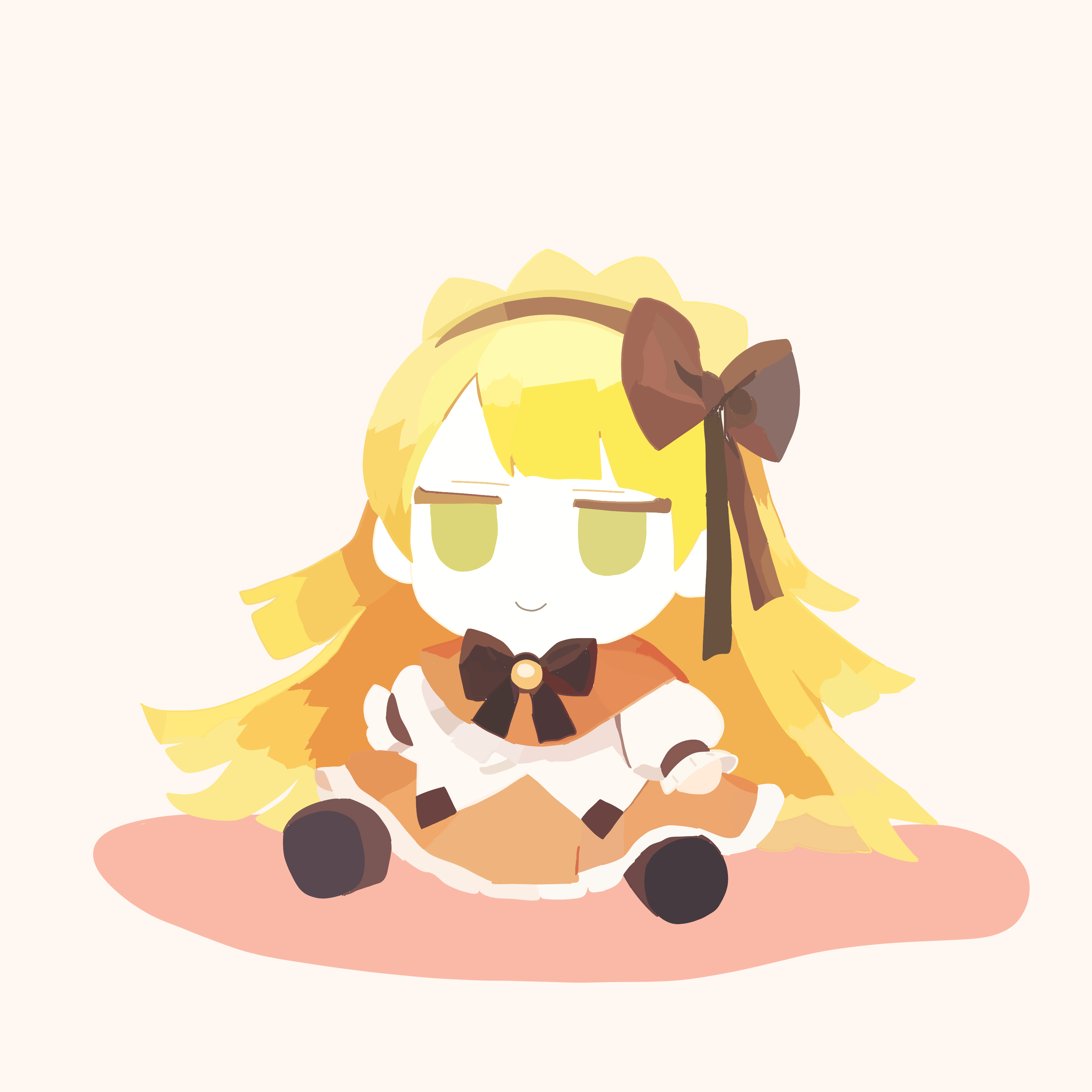 1girl absurdres blonde_hair brown_hairband capelet character_doll closed_mouth commentary doll english_commentary frilled_skirt frills fumo_(doll) green_eyes hairband highres lobotomy_corporation long_hair long_sleeves orange_capelet orange_skirt project_moon puffy_long_sleeves puffy_sleeves realtawil shirt simple_background skirt smile solo tiphereth_a_(project_moon) very_long_hair white_background white_shirt