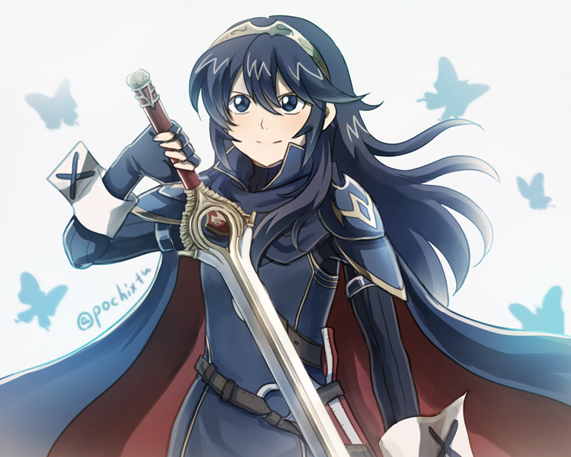 1girl armor artist_name blue_cape blue_eyes blue_gloves blue_hair bug butterfly cape commentary falchion_(fire_emblem) fingerless_gloves fire_emblem fire_emblem_awakening gloves gold_tiara holding holding_sword holding_weapon insect long_hair lucina_(fire_emblem) nintendo pochi_(furaigonn) red_cape scabbard sheath shoulder_armor simple_background solo sword two-sided_cape two-sided_fabric two-tone_cape weapon white_background