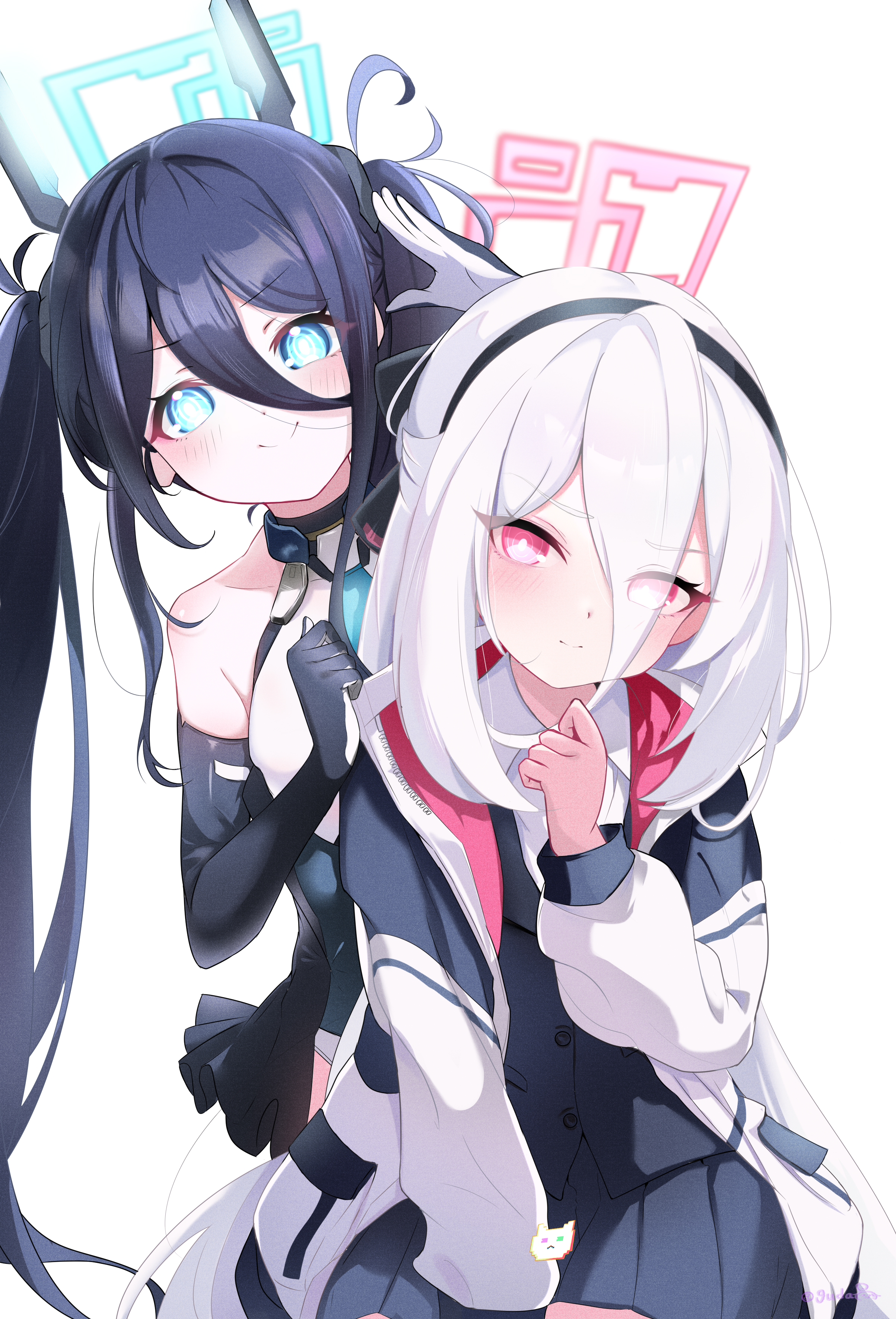 2girls absurdres aqua_halo aris_(armed)_(blue_archive) aris_(blue_archive) bare_shoulders black_hair black_hairband black_vest blue_archive blue_eyes blue_necktie blush breasts collared_shirt commentary_request double-parted_bangs grey_skirt guda_da hair_between_eyes hairband halo headgear highres holding_hands jacket kei_(blue_archive) kei_(new_body)_(blue_archive) leotard long_hair long_hair_between_eyes long_sleeves looking_at_viewer mecha_musume medium_breasts multiple_girls necktie official_alternate_costume official_alternate_hairstyle open_clothes open_jacket open_mouth pink_eyes rectangular_halo shirt short_necktie simple_background skirt sleeves_past_wrists smile twintails very_long_hair vest white_background white_hair white_jacket white_leotard white_shirt