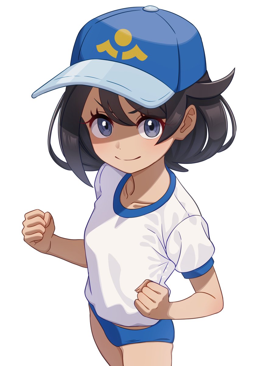 1girl alternate_costume baseball_cap black_hair blue_buruma blue_hat blush breasts buruma clenched_hand closed_mouth collarbone commentary_request female_protagonist_(pokemon_ww) grey_eyes gym_uniform hat highres katsushika_yuki nintendo pokemon pokemon_winds_and_waves shirt short_hair short_sleeves simple_background small_breasts smile solo white_background white_shirt