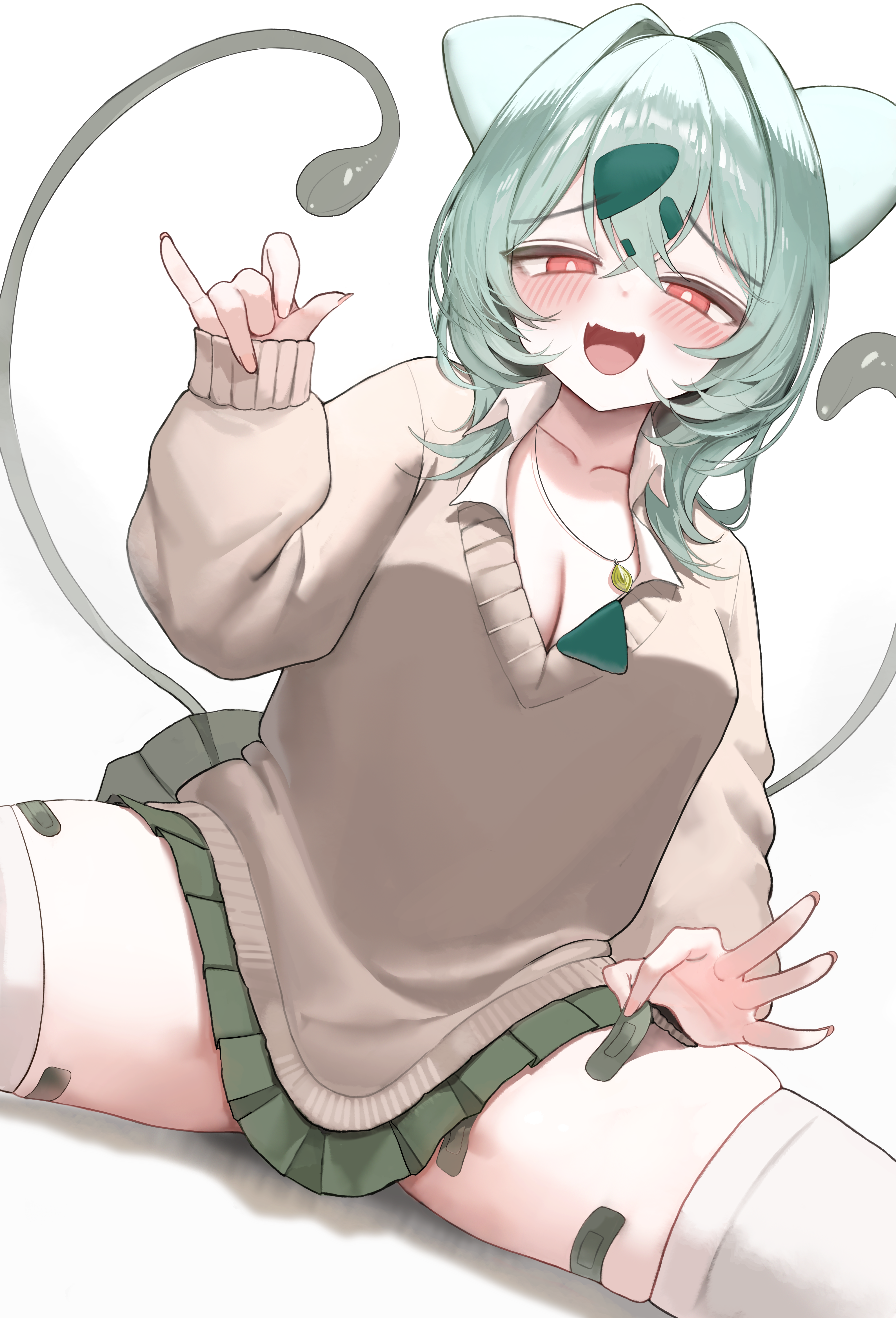 1girl :d absurdres bandaid bandaid_on_thigh blush breasts brown_sweater bulbasaur cleavage clothes_lift collarbone collared_shirt commentary_request crossed_bangs fangs from_below gen_1_pokemon green_hair green_skirt gyaru_bulbasaur gyaru_bulbasaur_(shin_no_tenpii) hair_between_eyes hair_intakes half-closed_eyes hand_up highres jewelry lifted_by_tail long_sleeves looking_at_viewer medium_breasts miniskirt multiple_tails necklace nintendo open_mouth personification pleated_skirt pokemon pokemon_pokopia red_eyes removing_bandaid se_tu_(55559229) shirt sidelocks simple_background skin_fangs skirt skirt_lift sleeves_past_wrists smile solo spread_legs sweater tail tail_raised thighhighs thighs tongue two_tails v-neck white_background white_shirt white_thighhighs zettai_ryouiki