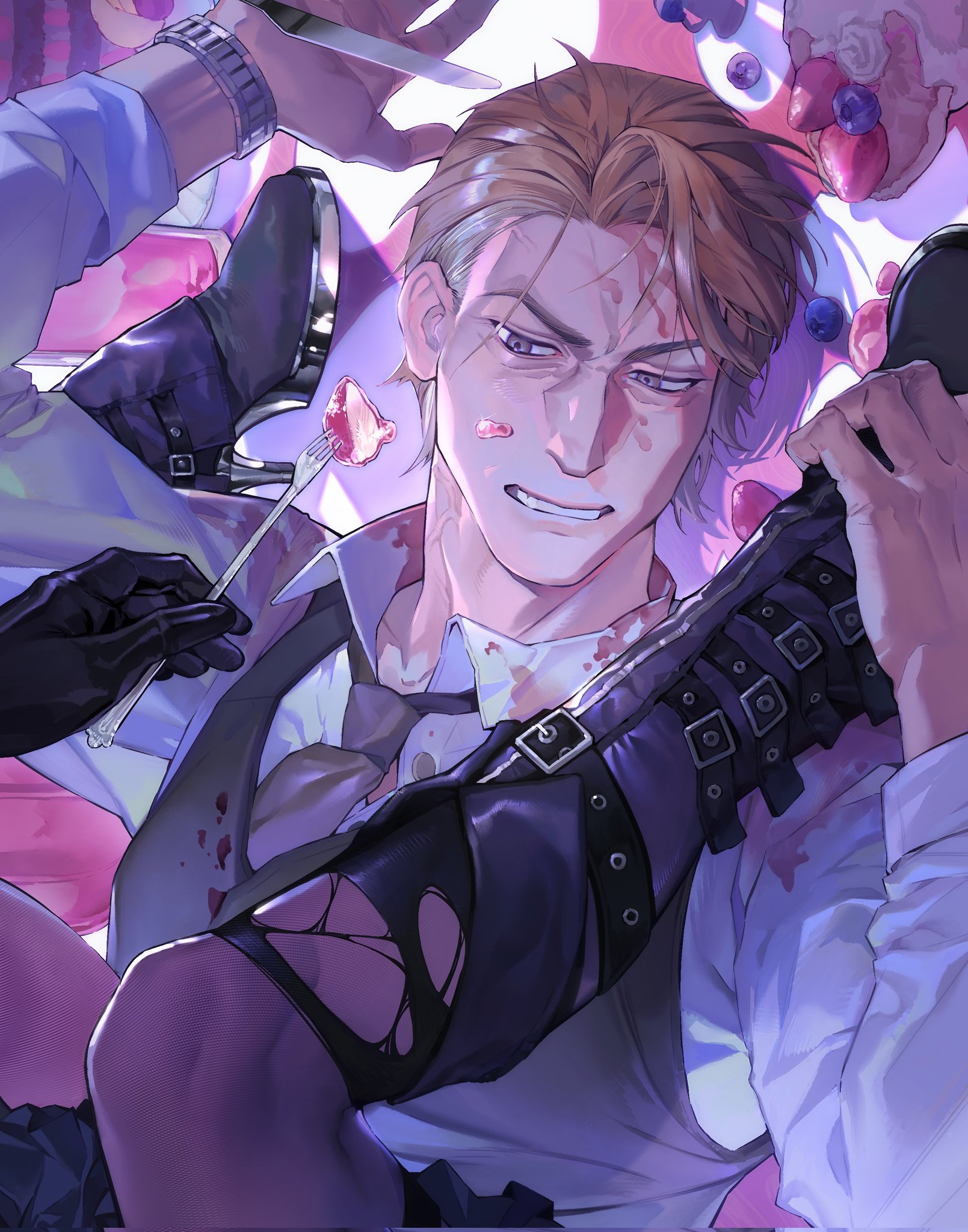 1boy 1girl avery_(degrees_of_lewdity) avery_(male)_(degrees_of_lewdity) black_boots black_gloves black_vest boots collared_shirt commentary degrees_of_lewdity fork gloves grimace hanstrmoft highres holding holding_fork long_sleeves male_focus necktie on_table pantyhose player_character_(degrees_of_lewdity) player_character_(female)_(degrees_of_lewdity) shirt sitting sitting_on_person solo_focus stained_clothes table teeth torn_clothes torn_socks vest watch white_shirt wrinkled_skin wristwatch