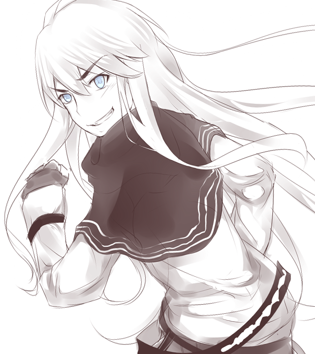 1boy androgynous belt blue_eyes commentary_request cowboy_shot fingerless_gloves gloves grey_theme grin hair_between_eyes hand_up long_hair long_sidelocks long_sleeves looking_at_viewer male_focus running shin_(highest1192) sidelocks simple_background smile solo teeth thor_(toaru_majutsu_no_index) toaru_majutsu_no_index toaru_majutsu_no_index:_new_testament white_background