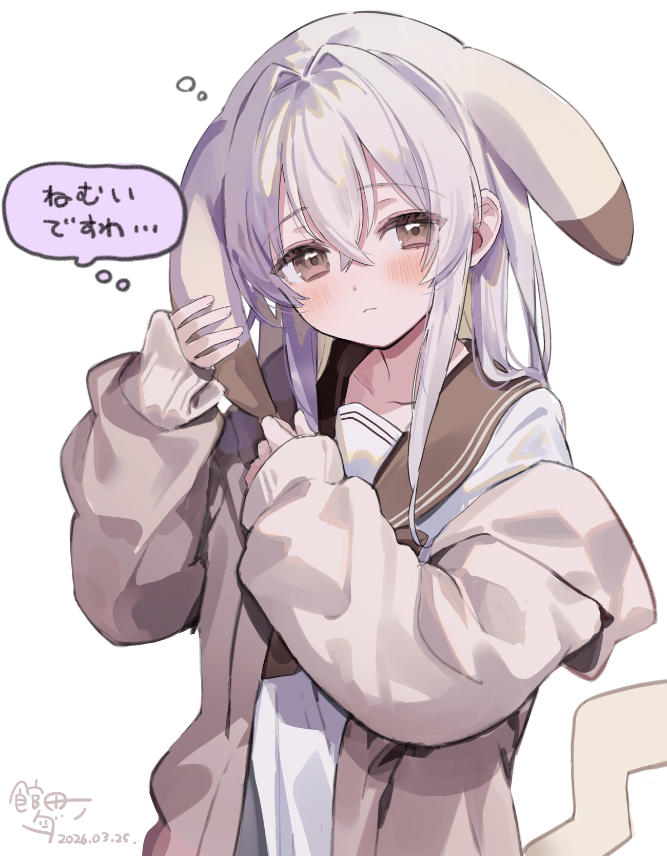1girl black_sailor_collar blush brown_eyes cardigan child closed_mouth collarbone commentary_request crossed_bangs dated extra_ears frown gen_1_pokemon grey_cardigan grey_hair hair_between_eyes hair_intakes hair_over_shoulder hands_up highres kanda_done long_sidelocks long_sleeves looking_at_viewer nintendo off_shoulder peakychu personification pikachu pokemon pokemon_pokopia sailor_collar shirt sidelocks simple_background sleeves_past_wrists solo speech_bubble tail translation_request upper_body white_background white_shirt