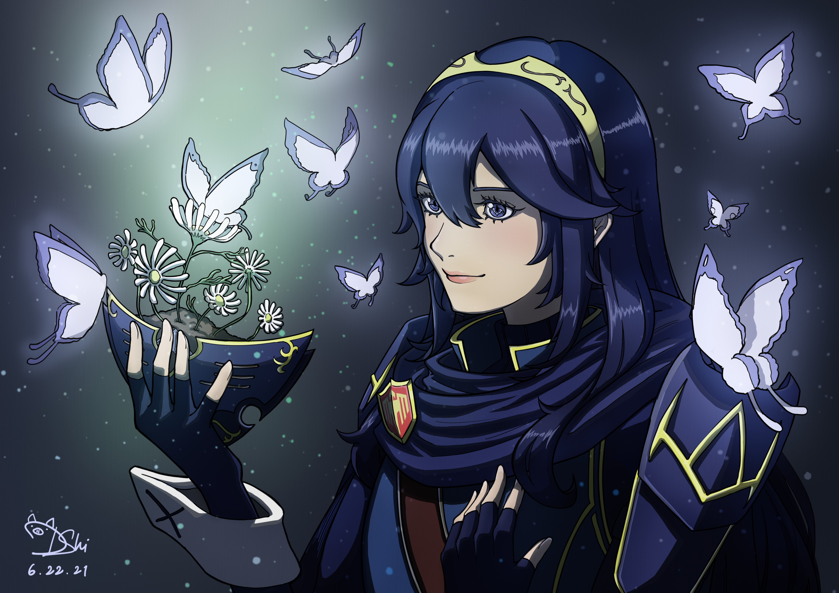 1girl absurdres armor black_background blue_cape blue_eyes blue_gloves blue_hair brand_of_the_exalt bug butterfly cape commentary dated dshi4sushi english_commentary fingerless_gloves fire_emblem fire_emblem_awakening flower gloves highres holding holding_mask insect lips long_hair looking_ahead lucina_(fire_emblem) mask nintendo shoulder_armor signature smile solo symbol_in_eye tiara upper_body
