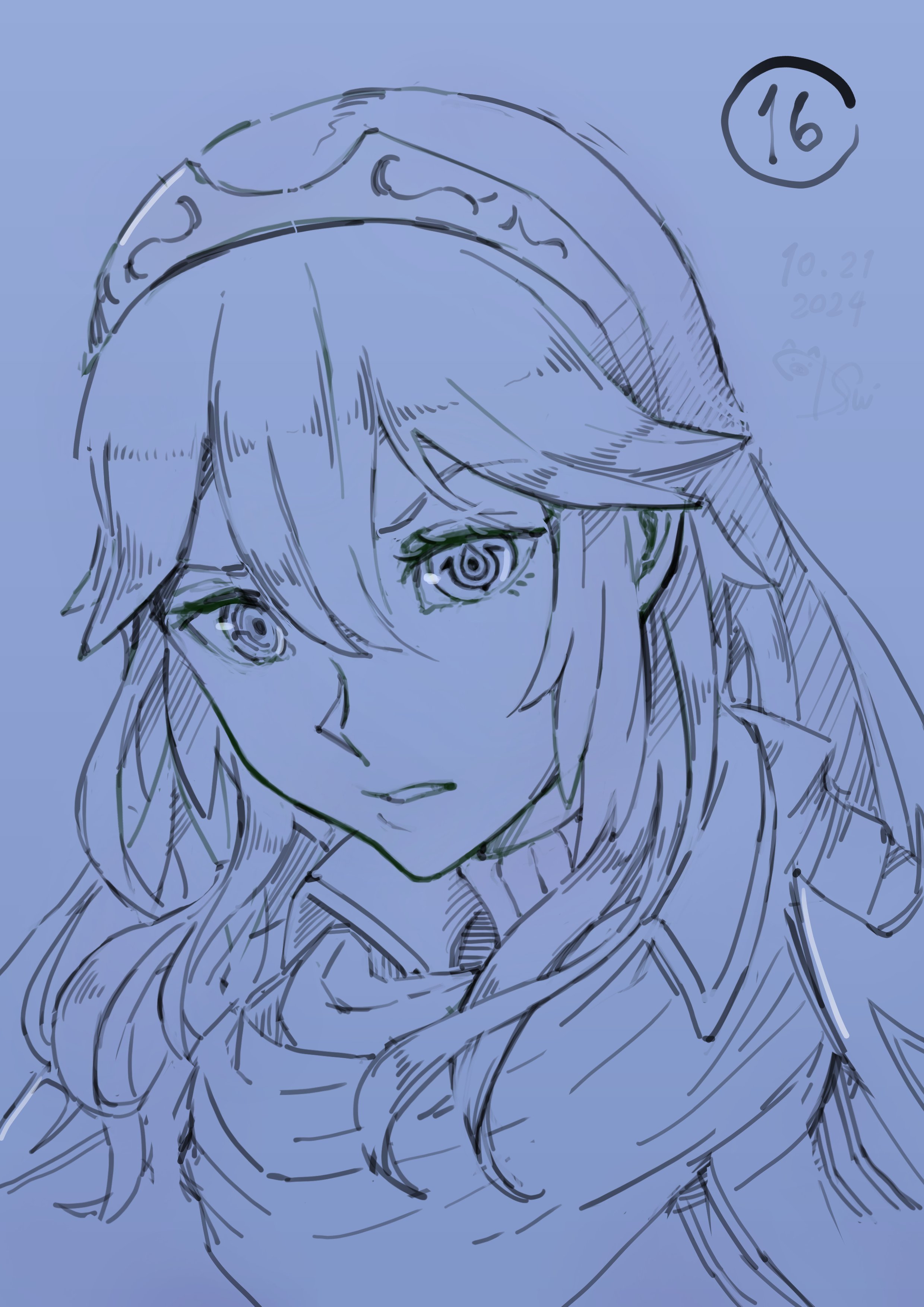 1girl absurdres blue_background blue_theme brand_of_the_exalt cape commentary dated dshi4sushi fire_emblem fire_emblem_awakening hair_between_eyes highres long_hair looking_at_viewer lucina_(fire_emblem) monochrome nintendo parted_lips signature solo symbol_in_eye tiara