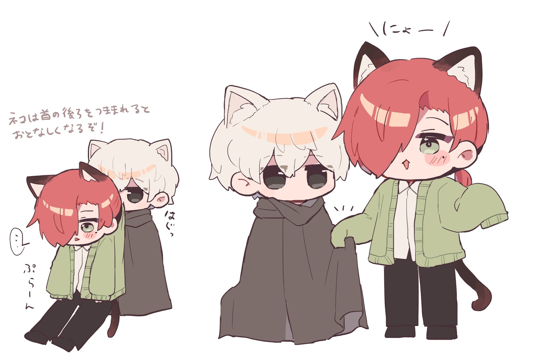 2boys :3 animal_ear_fluff biting_another's_clothes biting_nape black_eyes black_pants blush cardigan cat_boy chibi chibi_only cloak collared_shirt commentary_request dress_shirt green_cardigan green_eyes grey_cloak hair_over_one_eye highres hood hooded_cloak jitome kuchinashi_dabi male_focus multicolored_hair multiple_boys no_mouth okudo61 oshi_no_taisetsuna_hito_ni_narikawaru pants ponytail shirt simple_background sleeves_past_fingers sleeves_past_wrists sparkling_eyes standing tonimura_yui translation_request triangle_mouth two-tone_hair white_background white_hair white_shirt