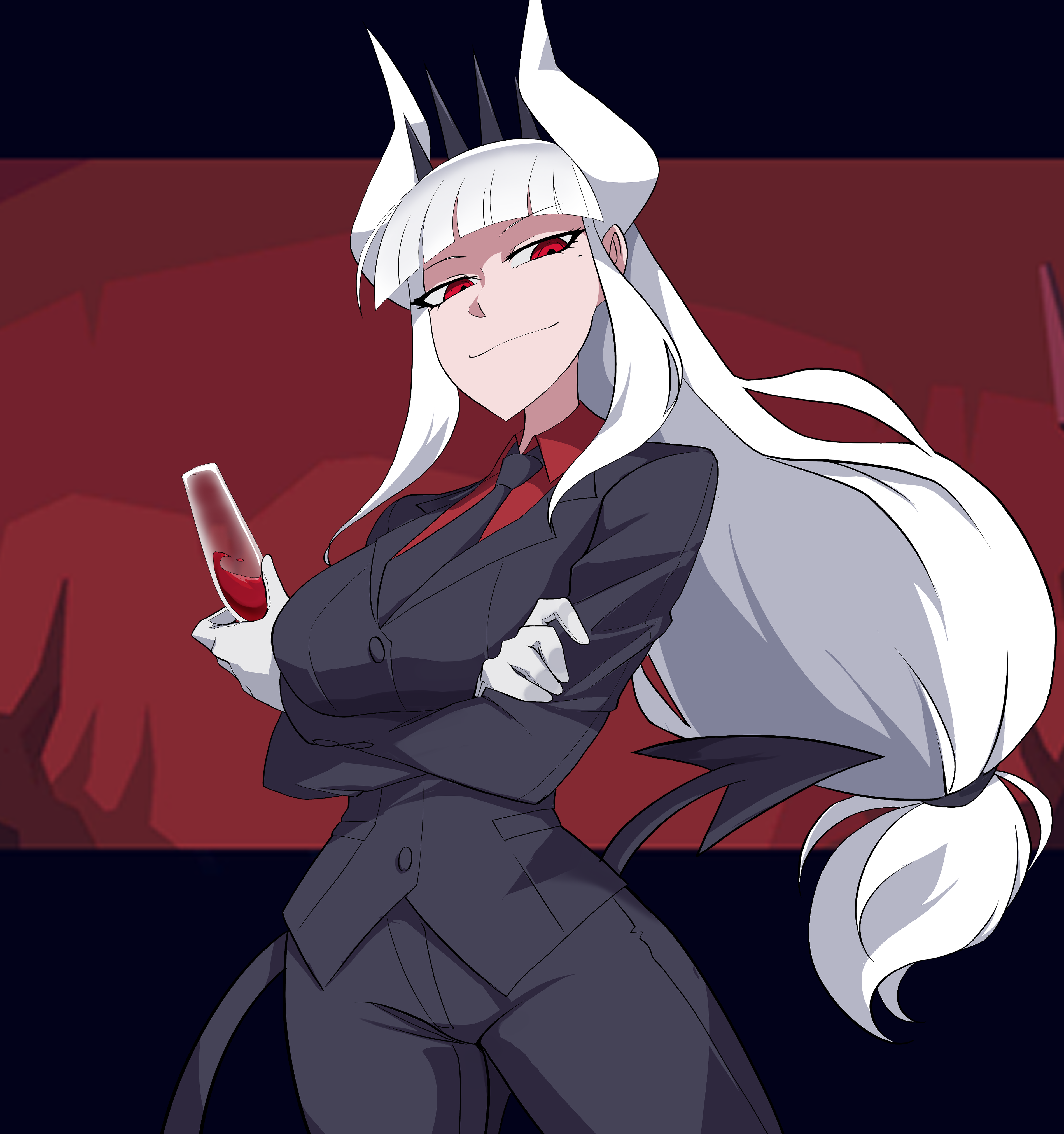 1girl absurdres alcohol arms_under_breasts black_jacket black_necktie black_pants blunt_bangs breasts closed_mouth commentary cowboy_shot crossed_arms cup demon_girl demon_horns demon_tail drinking_glass english_commentary gloves helltaker highres holding holding_cup horns jacket large_breasts long_hair looking_at_viewer lucifer_(helltaker) mole mole_under_eye necktie pants red_eyes s4_(s4see) smile solo tail white_gloves white_hair wine wine_glass