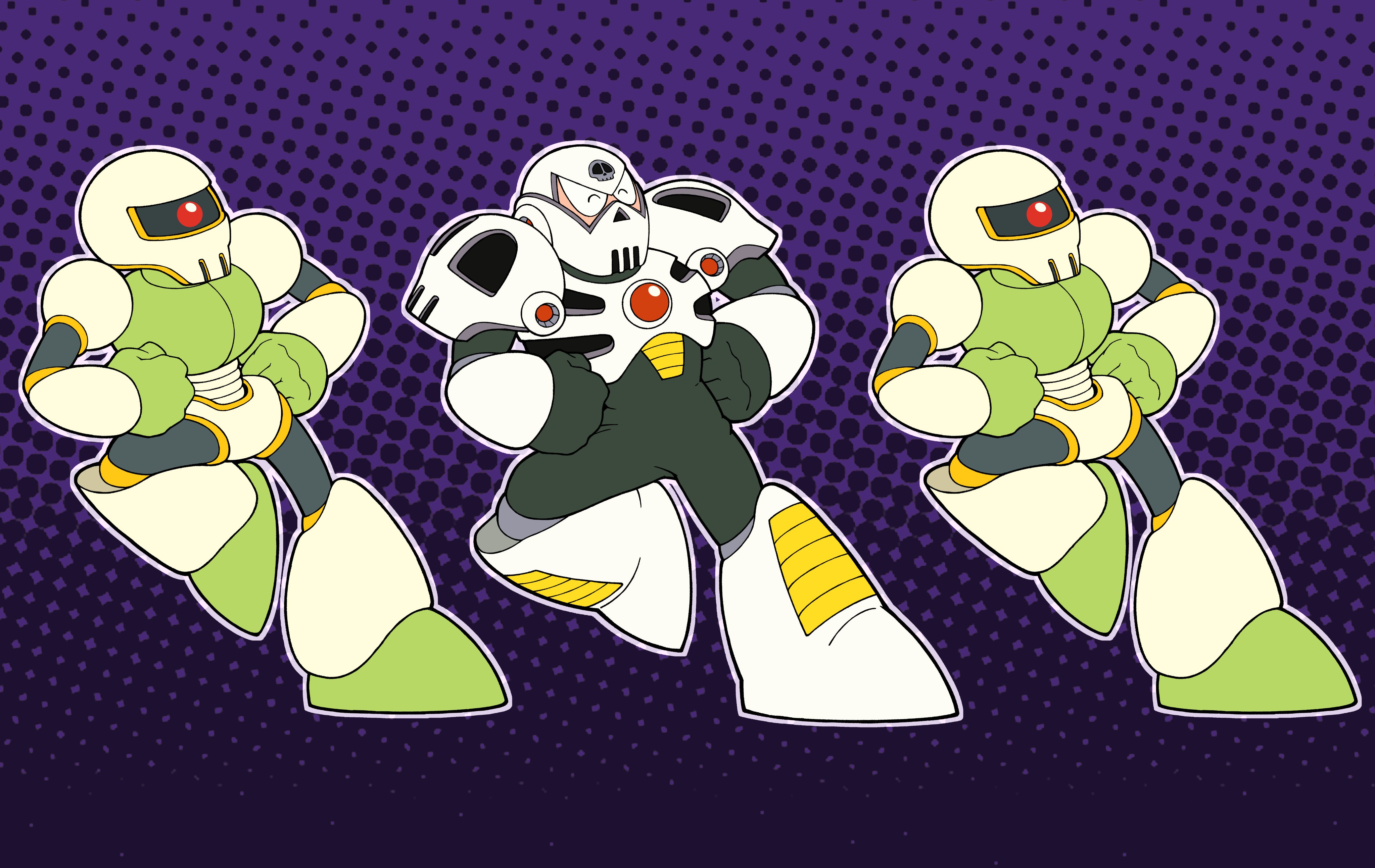 3boys absurdres android armor black_gloves chest_jewel clenched_hands closed_eyes dancing diegodoodles full_body gloves green_armor green_gloves green_helmet halloween hands_on_own_hips helmet highres mega_man_(classic) mega_man_(series) multiple_boys one-eyed red_eyes robot robot_ears skull_man spooky_scary_skeletons white_armor white_helmet