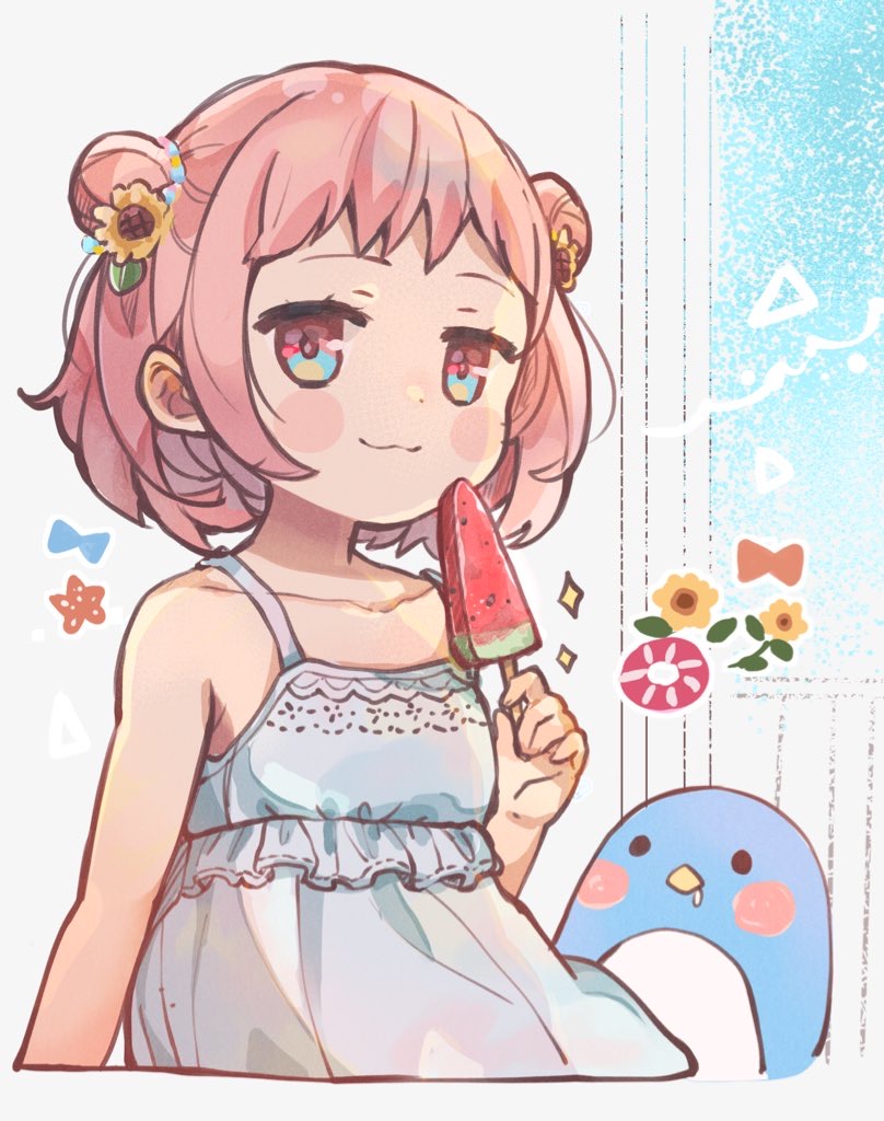 1girl bare_shoulders bird blue_eyes blush_stickers child commentary_request cropped_torso dot_nose double_bun dress flower food frilled_dress frills hacosumi hair_bun hair_flower hair_ornament hand_up holding holding_food holding_popsicle looking_at_viewer original penguin pink_hair popsicle short_hair sidelocks smug solo spaghetti_strap sparkle sunflower upper_body watermelon_bar white_dress yellow_flower