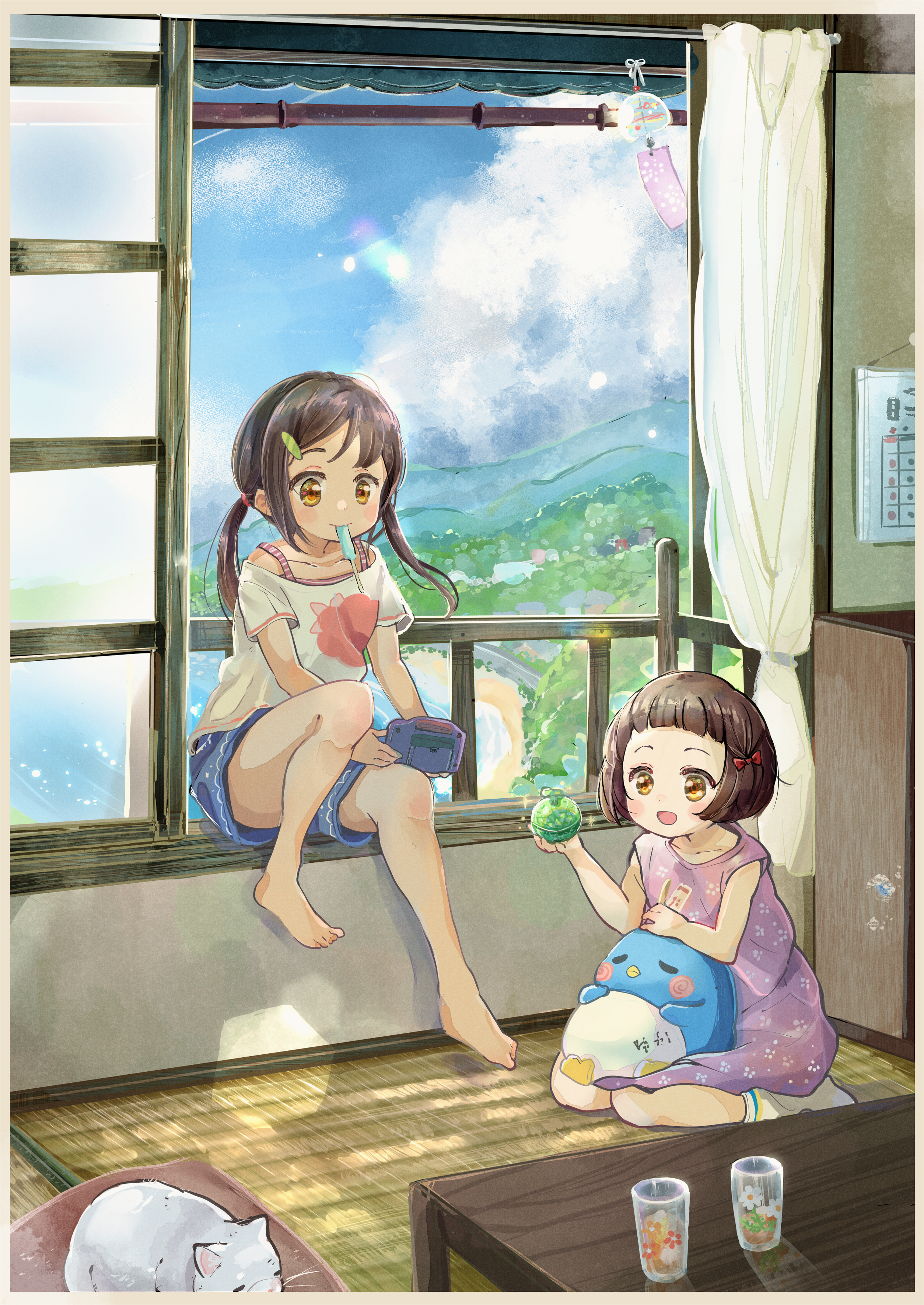 2girls :d absurdres animal balcony barefoot blue_shorts blush_stickers brown_hair calendar_(object) cat child closed_mouth cloud cloud_print collarbone commentary_request cup curtains day dress drinking_glass floral_print floral_print_dress food game_boy_advance hacosumi hair_ornament hairclip hand_up handheld_game_console highres hill holding holding_handheld_game_console ice_cream indoors knee_up lens_flare long_hair low_twintails multiple_girls off-shoulder_shirt off_shoulder on_windowsill open_mouth open_window original popsicle print_dress purple_dress shirt shore short_hair short_sleeves shorts siblings sidelocks sisters sitting sleeping_animal slice_of_life smile socks spaghetti_strap sparkle stuffed_animal stuffed_penguin stuffed_toy summer sunlight table twintails undershirt washitsu water white_cat white_shirt white_socks window yellow_eyes