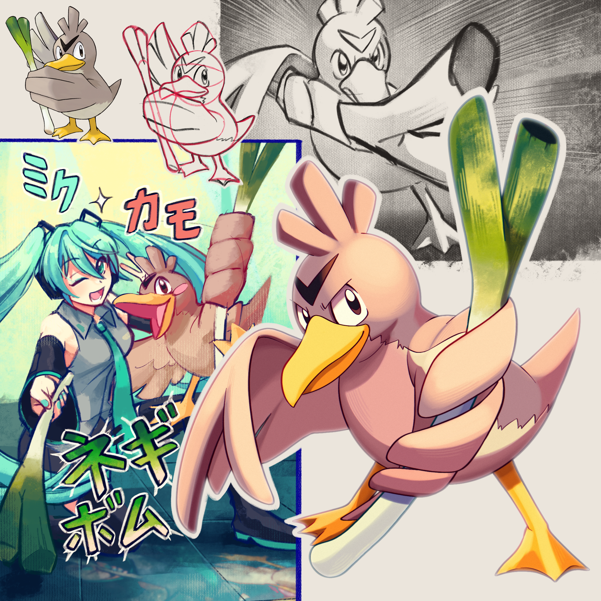 1girl aqua_eyes aqua_hair aqua_necktie bare_shoulders beak bird black_sleeves commentary_request detached_sleeves farfetch'd food gen_1_pokemon grey_shirt hair_between_eyes hatsune_miku headphones headset highres holding holding_food holding_spring_onion holding_vegetable necktie nintendo number_tattoo one_eye_closed open_mouth pokemon pokemon_(creature) pokemon_firered_and_leafgreen shirt shoupitsuki sketch sleeveless sleeveless_shirt smile spring_onion standing tattoo thighhighs twintails vegetable vocaloid wings