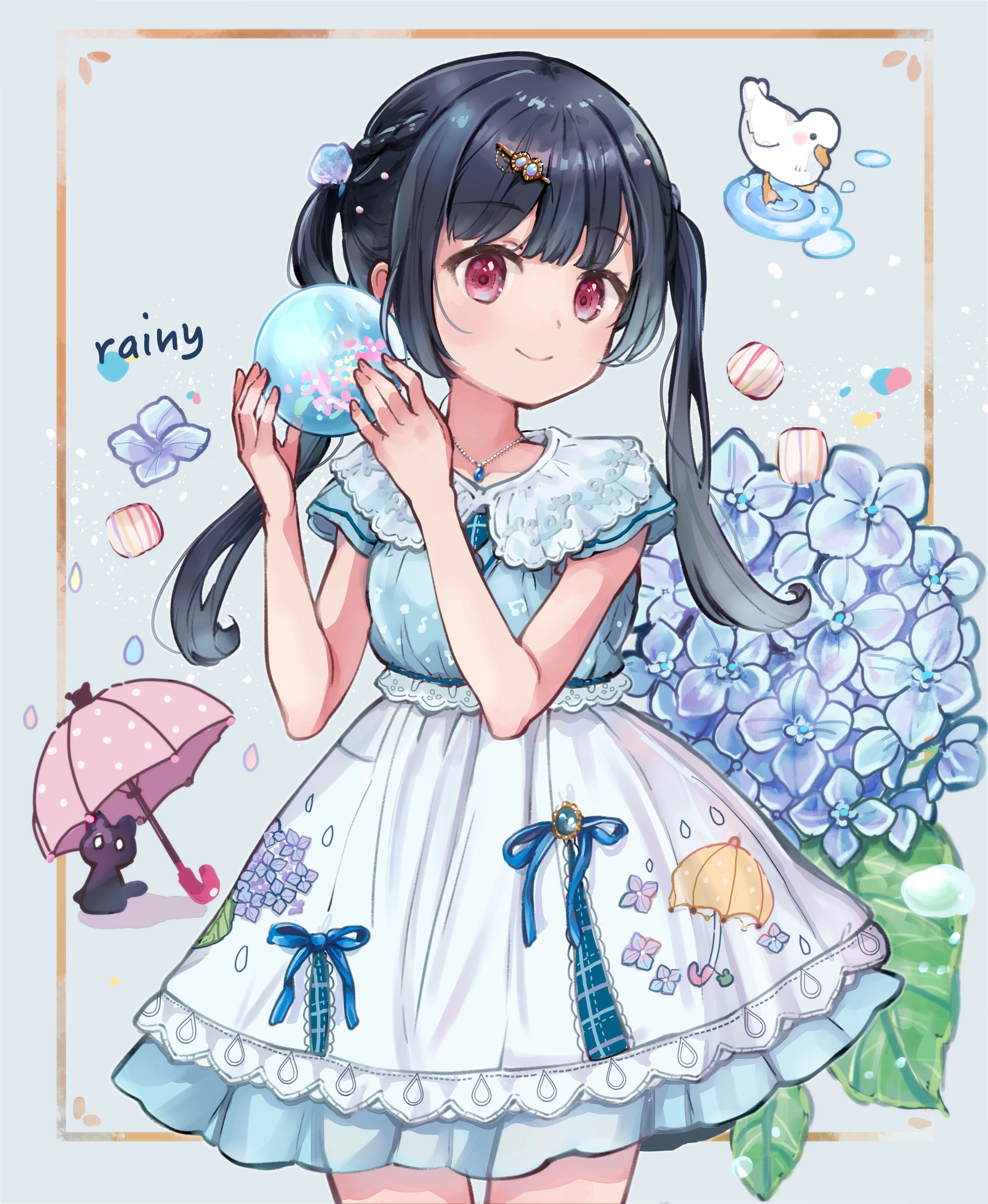1girl absurdres animal apron ball bird black_hair blue_dress blue_flower blue_gem blue_ribbon cat closed_mouth commentary_request cowboy_shot dress duck falling_petals flower gem hacosumi hair_ornament hands_up highres holding holding_ball hydrangea jewelry long_hair necklace original patch petals pink_eyes puddle ribbon short_sleeves sidelocks smile solo twintails umbrella umbrella_print waist_apron