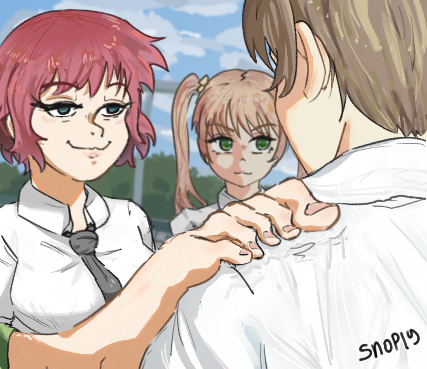 1boy 2girls :3 akakichi_no_eleven akakichi_no_eleven_redraws aqua_eyes artist_name black_necktie blonde_hair braid brown_hair collared_shirt commentary commission english_commentary foot_on_another's_shoulder green_eyes highres ibarazaki_emi katawa_shoujo meme multiple_girls nakai_hisao necktie parody red_hair shirt short_hair smug snoply tezuka_rin twin_braids white_shirt