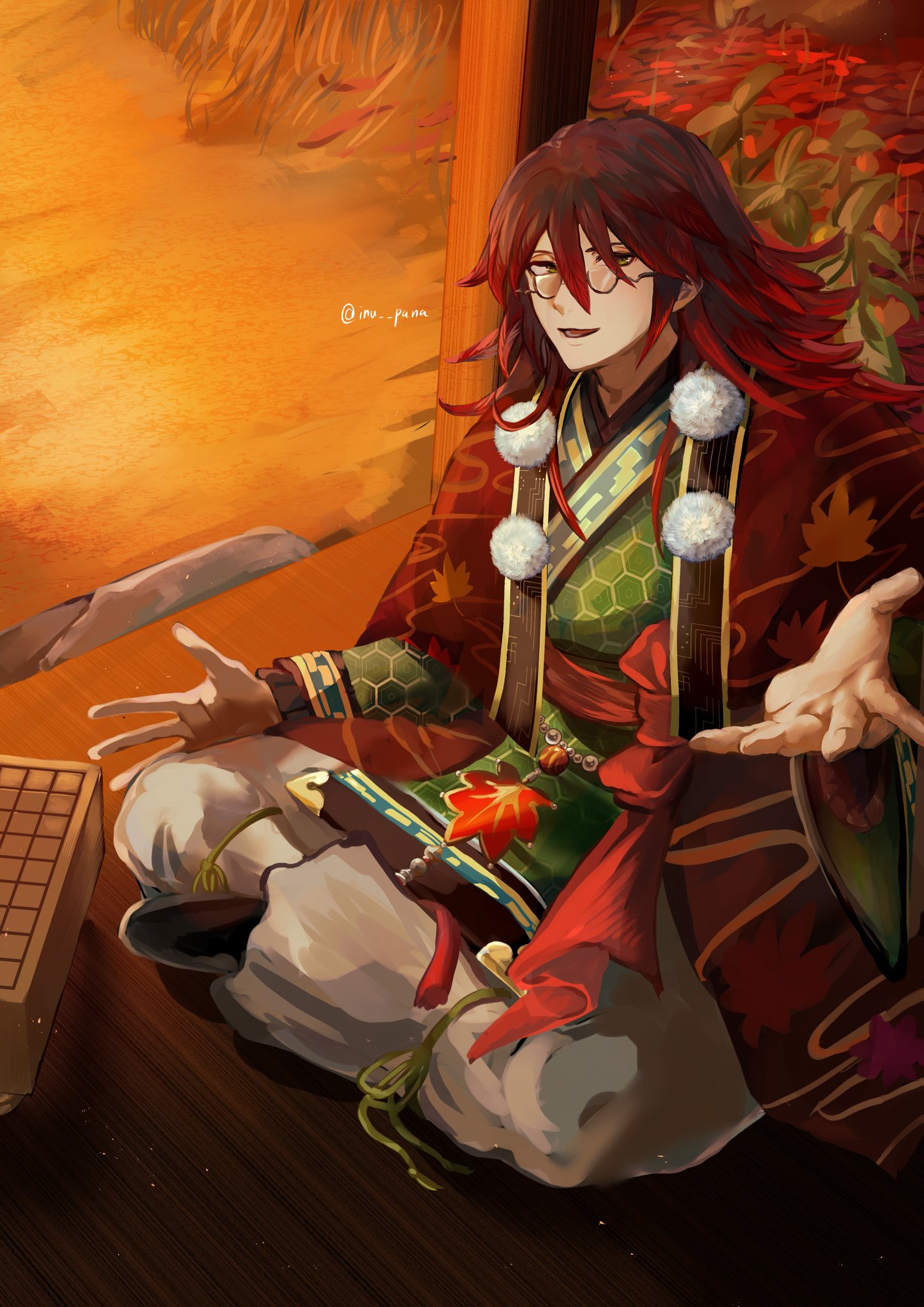 1boy brown_hair commentary_request glasses gradient_hair green_eyes hair_between_eyes highres inu_pana japanese_clothes kurama_(rune_factory) long_hair looking_at_viewer male_focus multicolored_hair red_hair rune_factory rune_factory:_guardians_of_azuma wide_sleeves