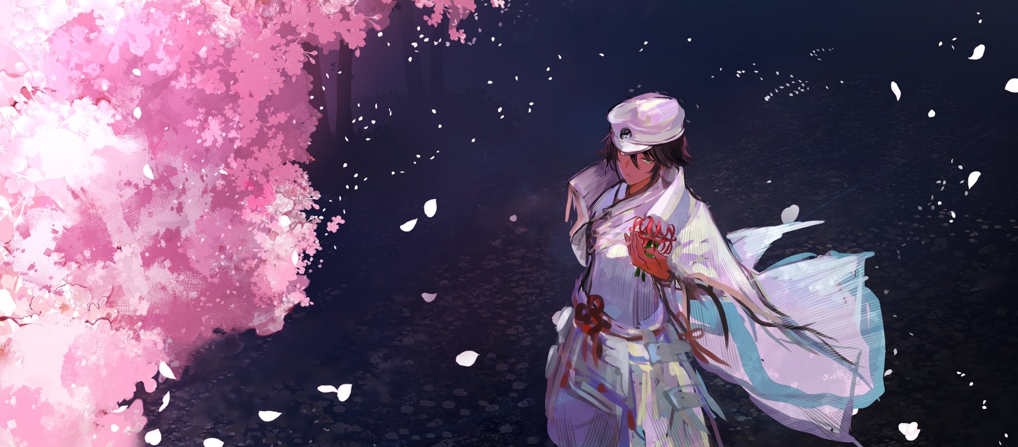 1boy black_hair cape cherry_blossoms commentary dark-skinned_male dark_skin highres ikaruga_(rune_factory) inu_pana japanese_clothes male_focus rune_factory rune_factory:_guardians_of_azuma untranslatable_commentary white_cape yin_yang