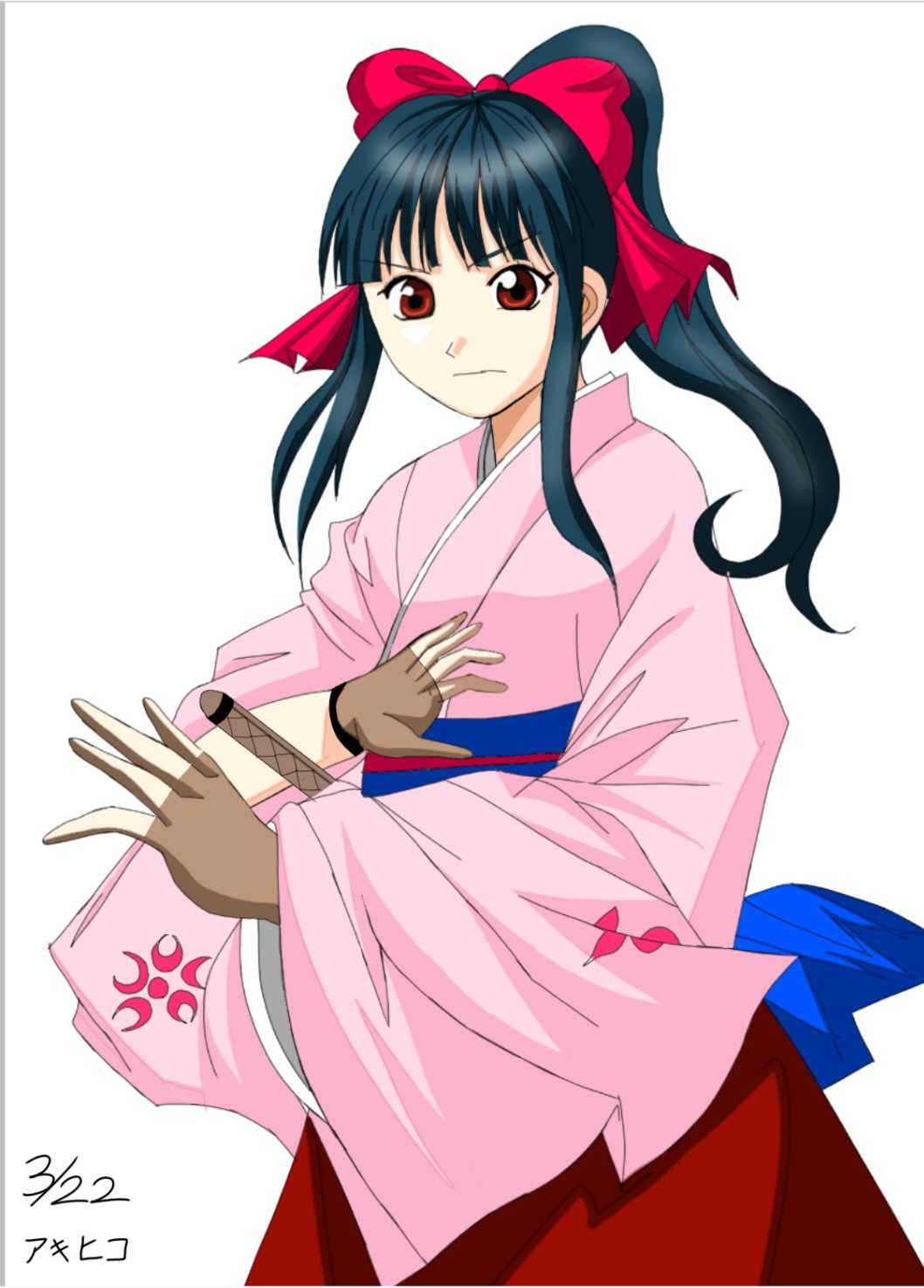 1girl artist_name blue_hair bow breasts brown_eyes crossed_arms fighting_stance fingerless_gloves gloves hair_ribbon highres japanese_clothes legs long_hair long_skirt looking_at_viewer red_bow ribbon sakura_taisen sega serious shinguuji_sakura skirt small_breasts solo sword thighs weapon