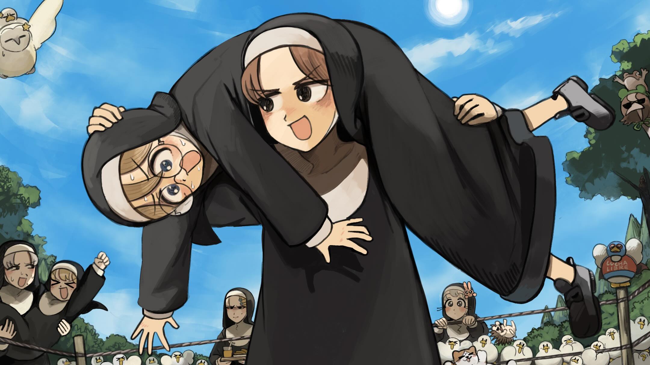 >_< 6+girls :d bendy_straw bird black_shoes blonde_hair blue_eyes brown_eyes brown_hair bunny_nun_(diva) carrying cat chicken clumsy_nun_(diva) commentary cup diva_(hyxpk) drinking_straw duck english_commentary eyelashes frog glasses glasses_nun_(diva) grey_hair hair_ornament hedgehog highres hungry_nun_(diva) jealous little_nuns_(diva) mole mole_on_cheek mole_under_mouth multiple_girls nervous_sweating nun open_mouth ostrich outdoors owl rabbit_hair_ornament round_eyewear scared shoes smile smug_nun_(diva) star_ornament strict_nun_(diva) sweat traditional_nun tree