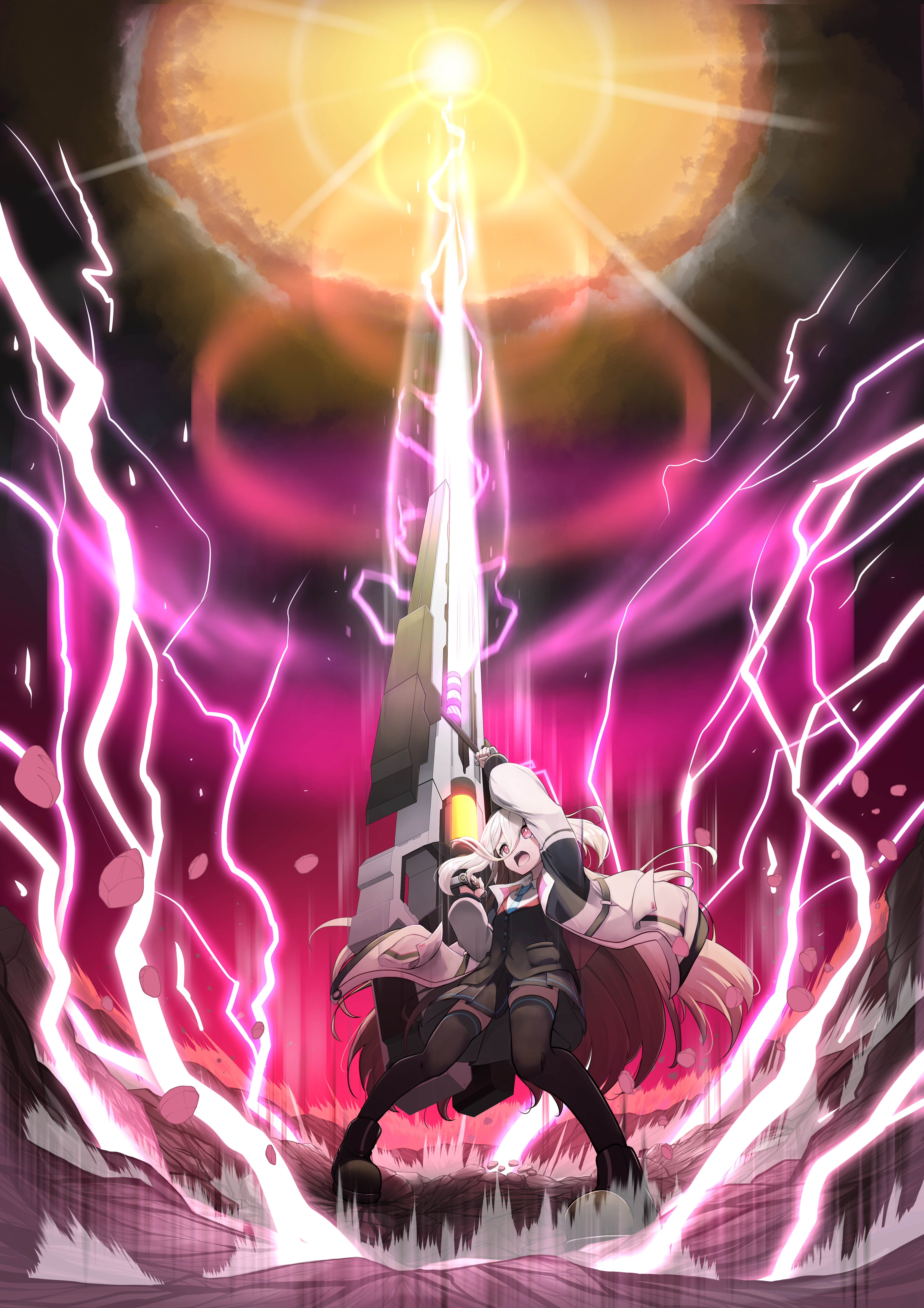 1girl absurdres aiming_up aurora black_shoes black_skirt black_thighhighs blue_archive commentary_request crack cracked_floor drawing_rak forehead from_below full_body gun halo highres holding holding_gun holding_weapon jacket kei_(blue_archive) kei_(new_body)_(blue_archive) laser lightning long_hair open_mouth pink_eyes pink_halo railgun rectangular_halo shirt shoes sidelocks skirt thighhighs very_long_hair weapon white_hair white_jacket white_shirt