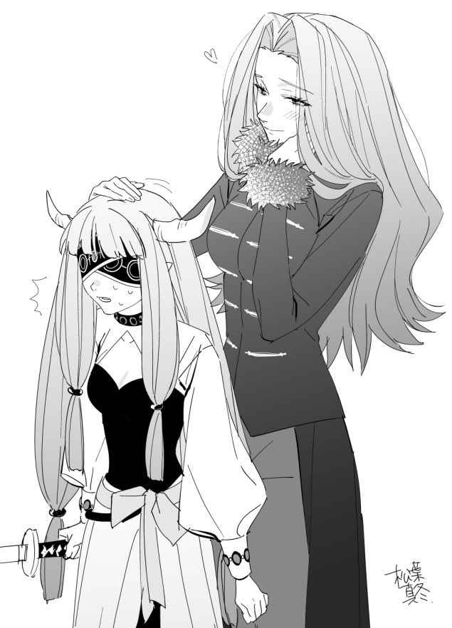 2girls black_choker braid choker closed_mouth coat commentary_request demon demon_girl demon_horns fur-trimmed_coat fur_trim greyscale headpat holding holding_sword holding_weapon horns long_hair matsuba_000 mature_female methode_(sousou_no_frieren) monochrome multiple_braids multiple_girls pants simple_background skirt sousou_no_frieren sweat sword tall_female weapon white_background zorida_(sousou_no_frieren)