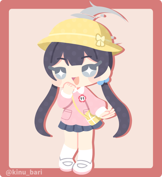 +_+ 1girl :d black_hair black_skirt blue_archive blunt_bangs blush_stickers border chibi chibi_only commentary_request double-parted_bangs drop_shadow full_body grey_background grey_eyes hair_bobbles hair_ornament hand_up hat kindergarten_uniform kinubari_nerune kisaki_(blue_archive) kisaki_(kindergarten_uniform)_(blue_archive) kneehighs long_hair long_sleeves low_twintails no_lineart open_mouth outside_border pink_shirt pleated_skirt red_border school_hat shirt shoes simple_background skirt smile socks solo standing twintails twitter_username white_shoes white_socks yellow_hat