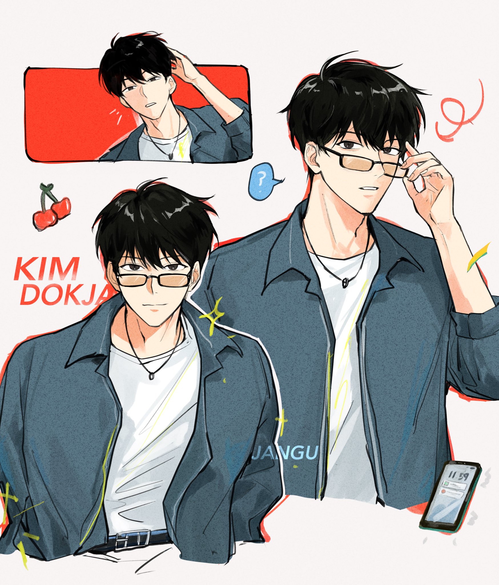 1boy ? abopikjang adjusting_eyewear belt bespectacled black_hair blue_jacket character_name commentary glasses highres jacket kim_dokja male_focus multiple_views omniscient_reader's_viewpoint phone shirt shirt_tucked_in short_hair spoken_question_mark untranslatable_commentary white_shirt