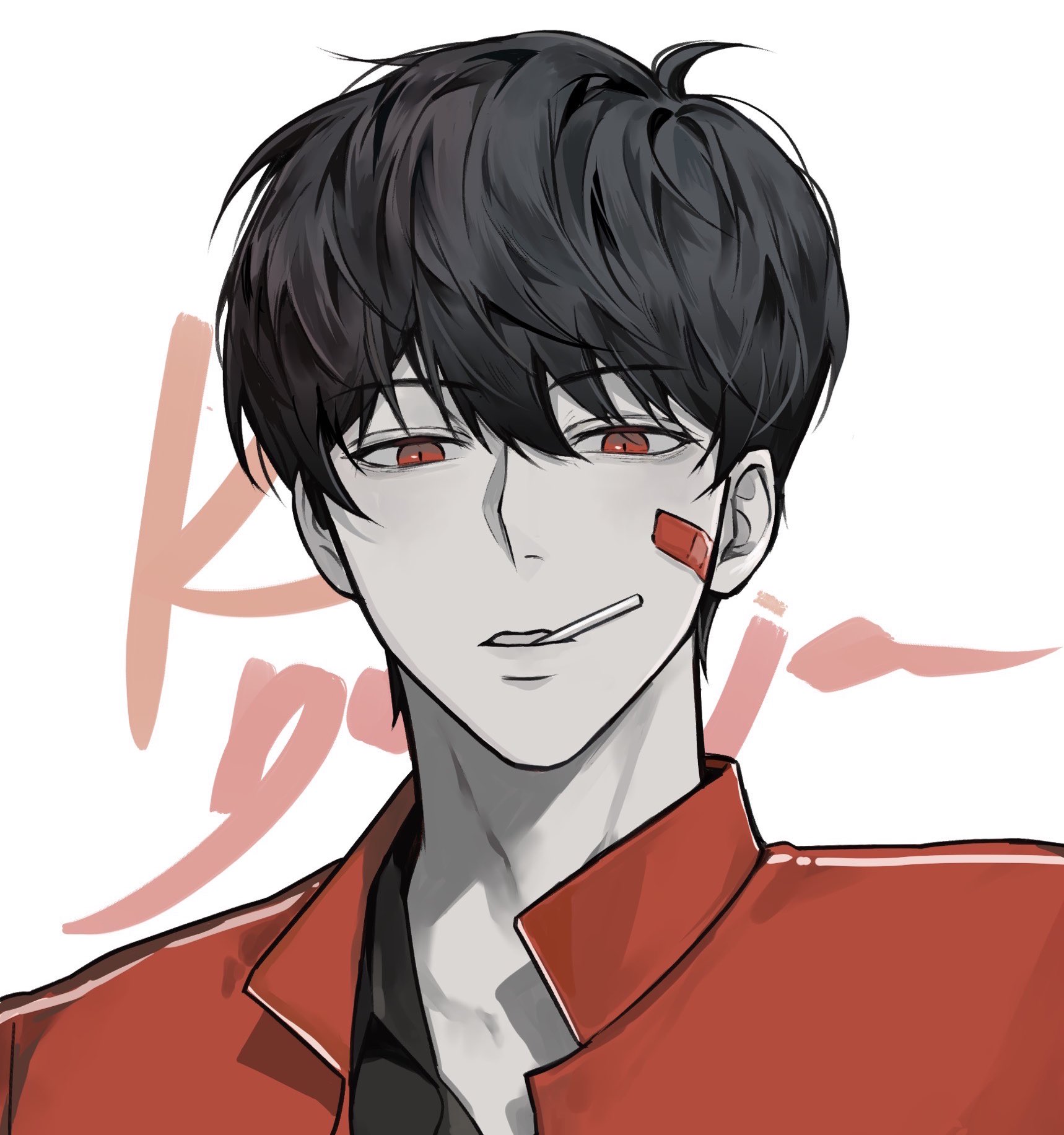 1boy abopikjang aegyo_sal bandage_on_face bandages black_hair black_shirt character_name commentary english_commentary facing_viewer highres jacket kim_dokja limited_palette looking_at_viewer male_focus monochrome omniscient_reader's_viewpoint parted_lips red_eyes red_jacket shirt short_hair solo