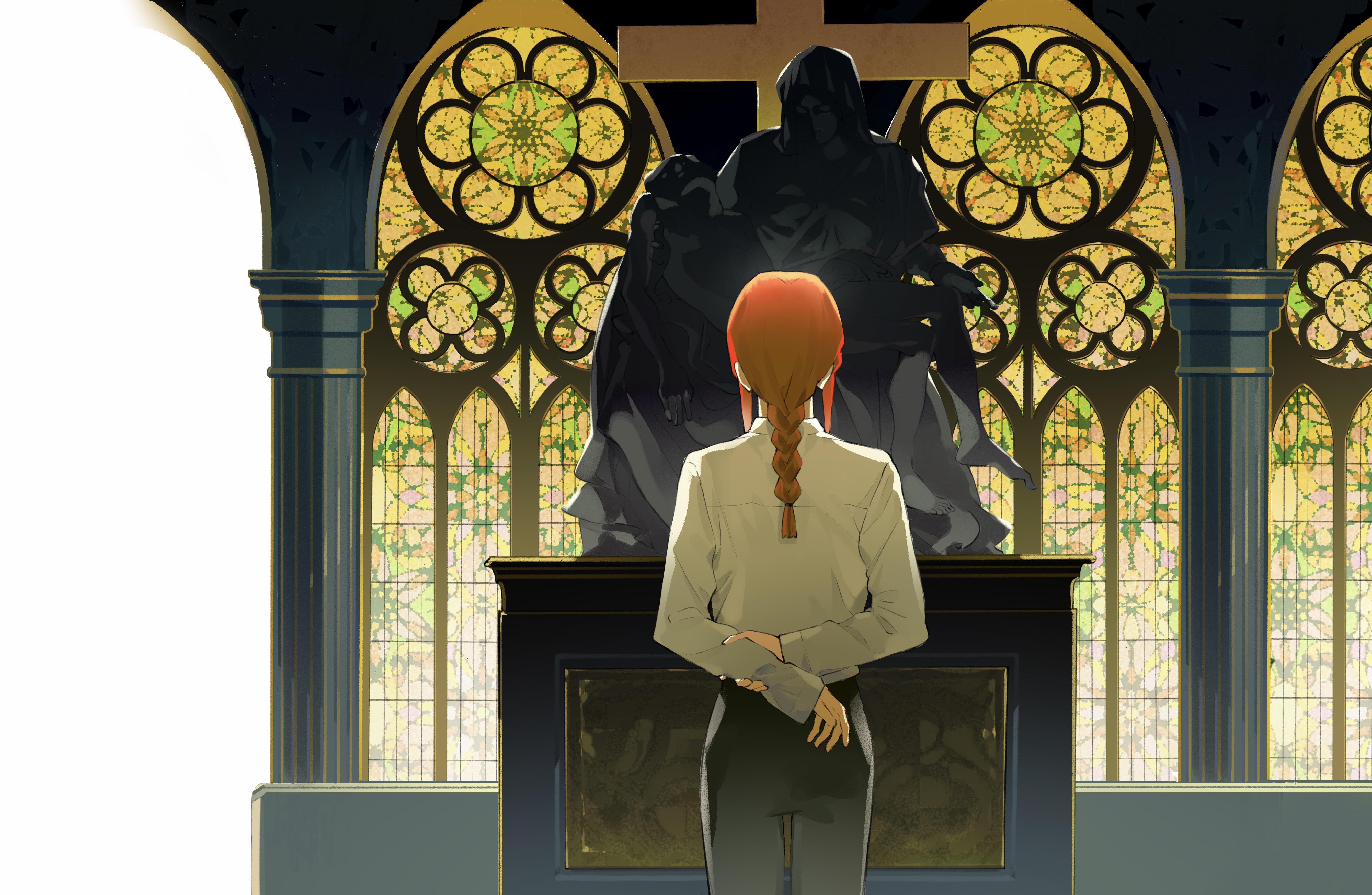 1girl absurdres arms_behind_back black_pants braid braided_ponytail chainsaw_man church commentary_request cowboy_shot cross dress_shirt facing_away fine_art_parody hand_on_own_arm highres holding long_hair long_sleeves makima_(chainsaw_man) pants parody pieta pillar red_hair shirt sidelocks solo stained_glass standing statue tuzaixia